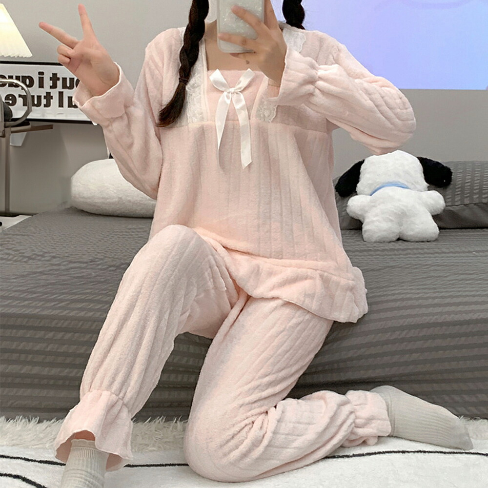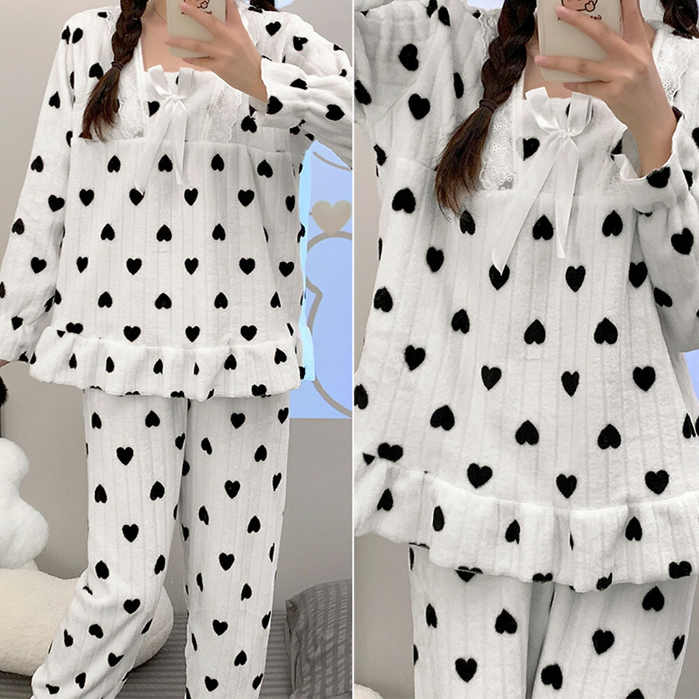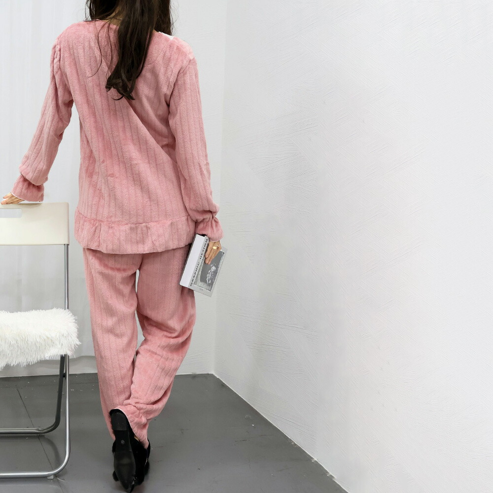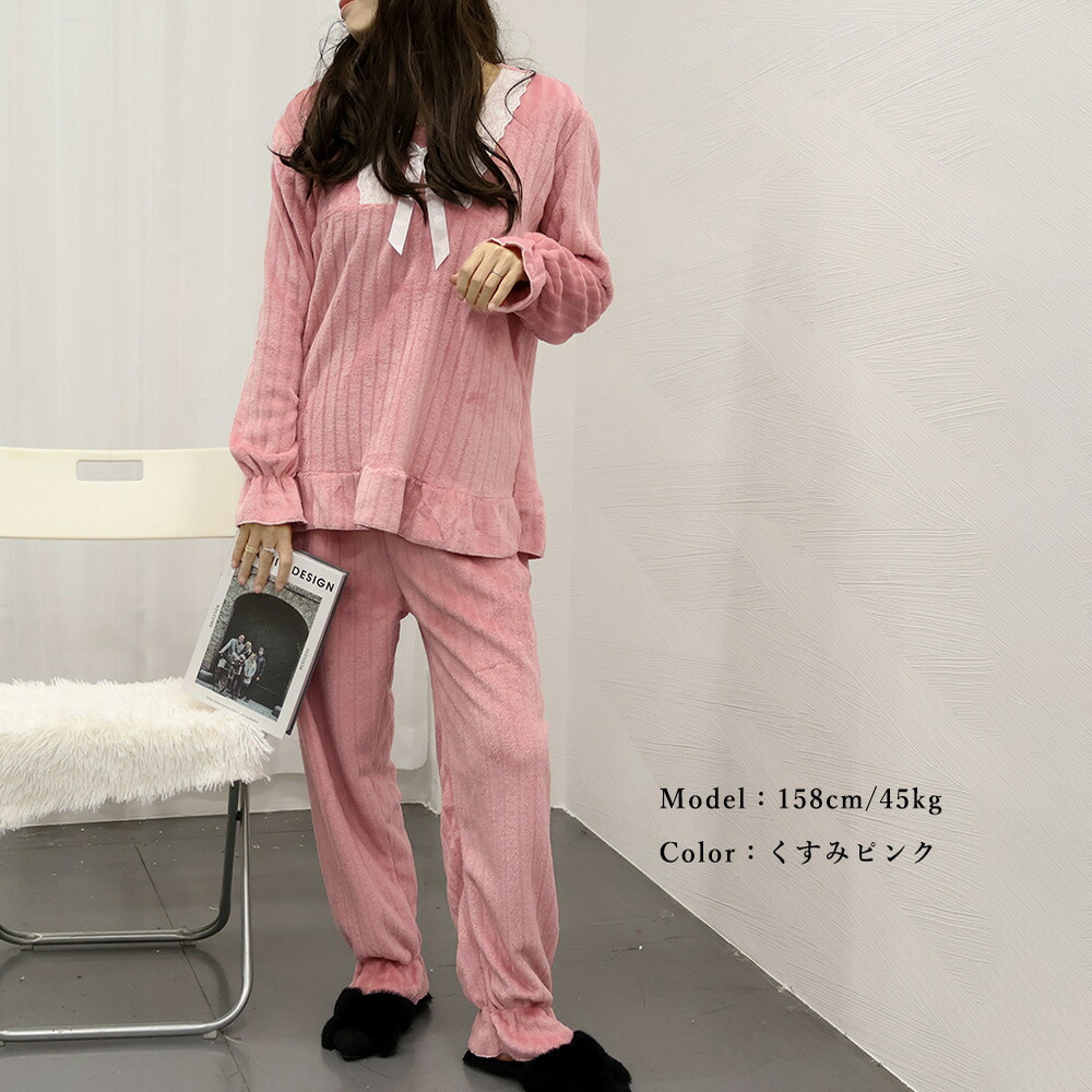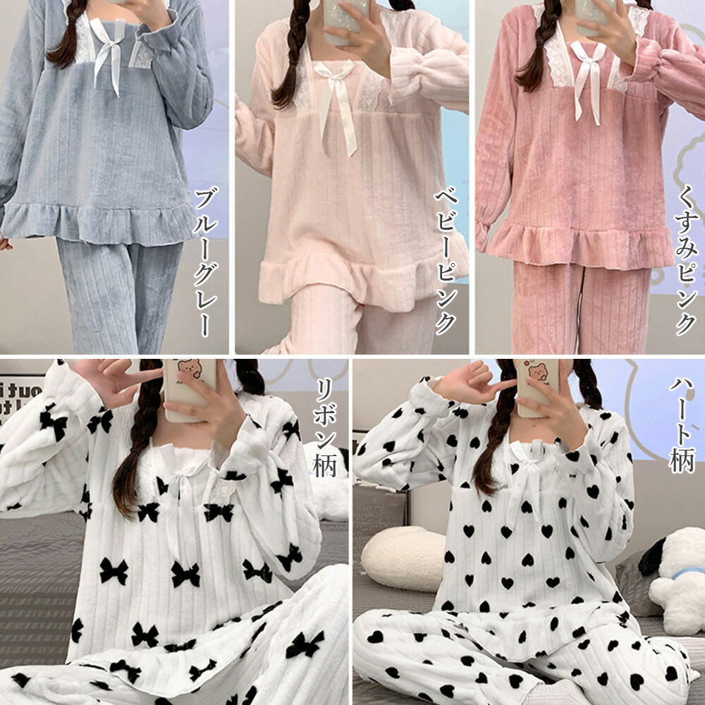 フリースパジャマ 上下セットアップ 韓 インナー 下着 ナイトウエア 大人気! くすみピンク ハート柄 ブルーグレー ベビーピンク リボン柄