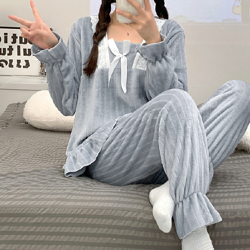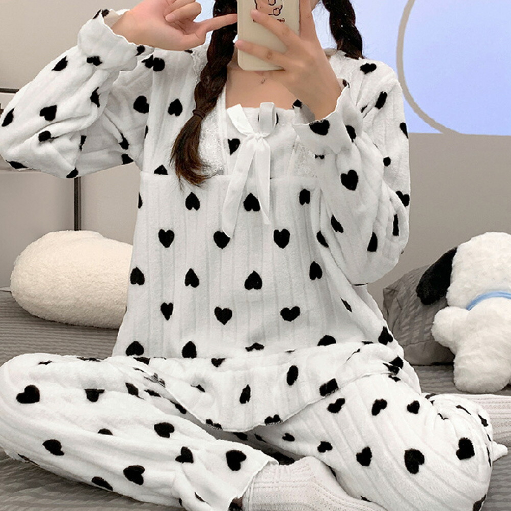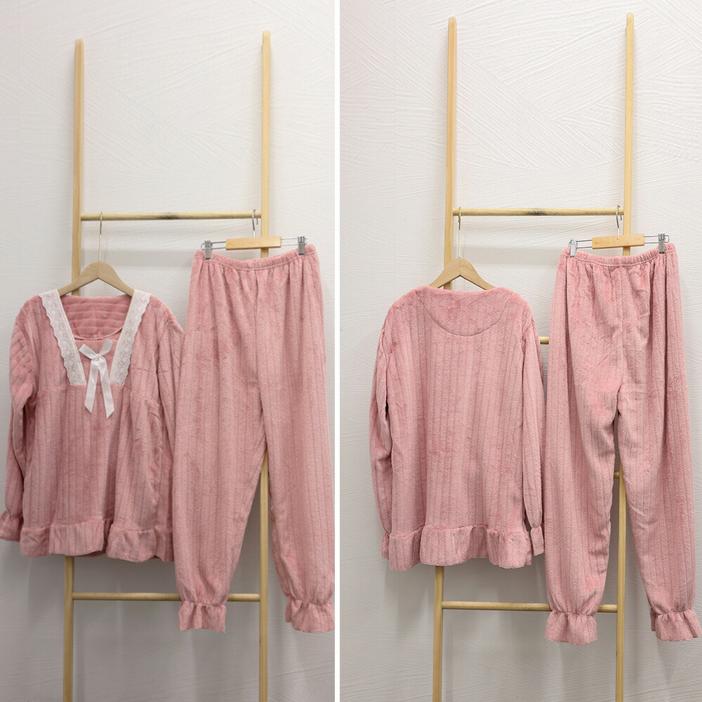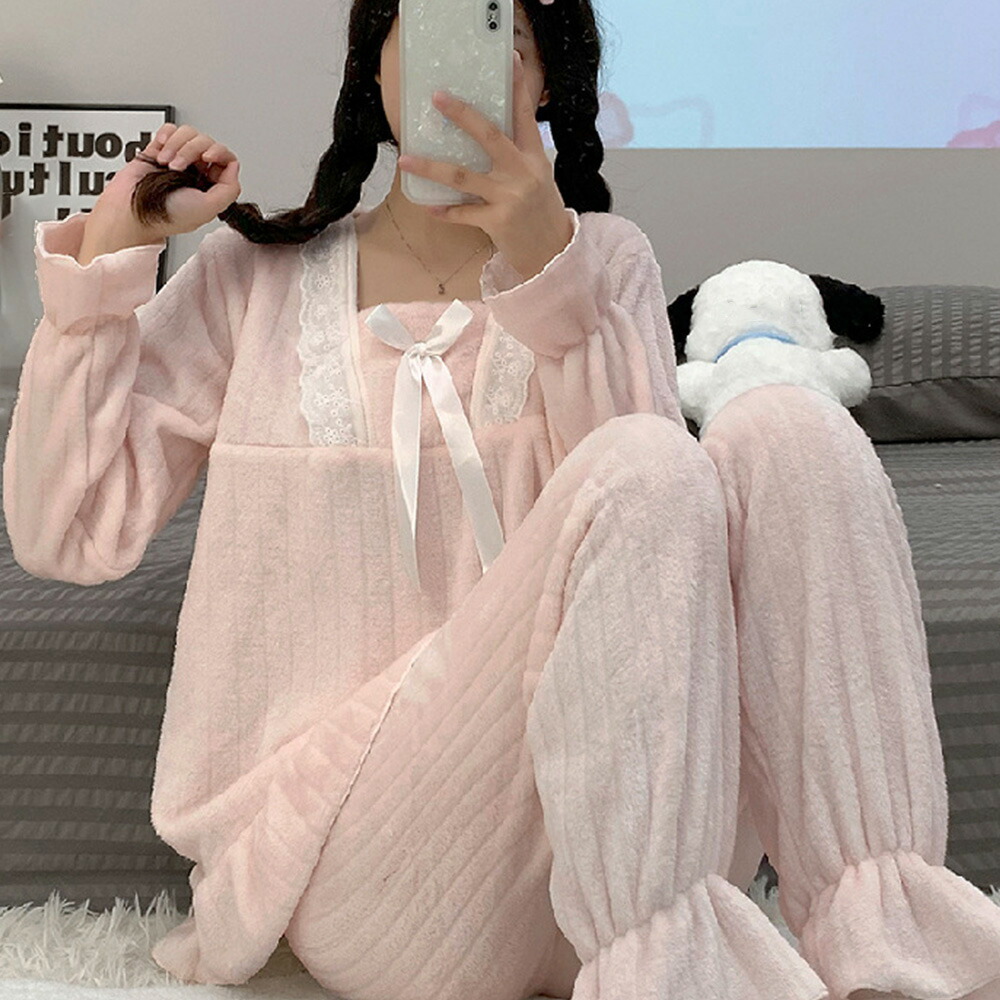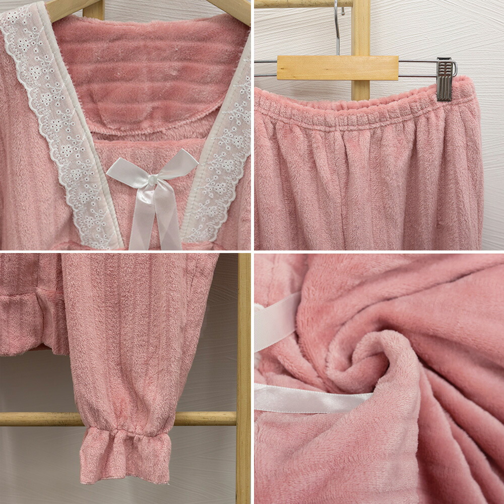 フリースパジャマ 上下セットアップ 韓 インナー 下着 ナイトウエア 大人気! くすみピンク ハート柄 ブルーグレー ベビーピンク リボン柄