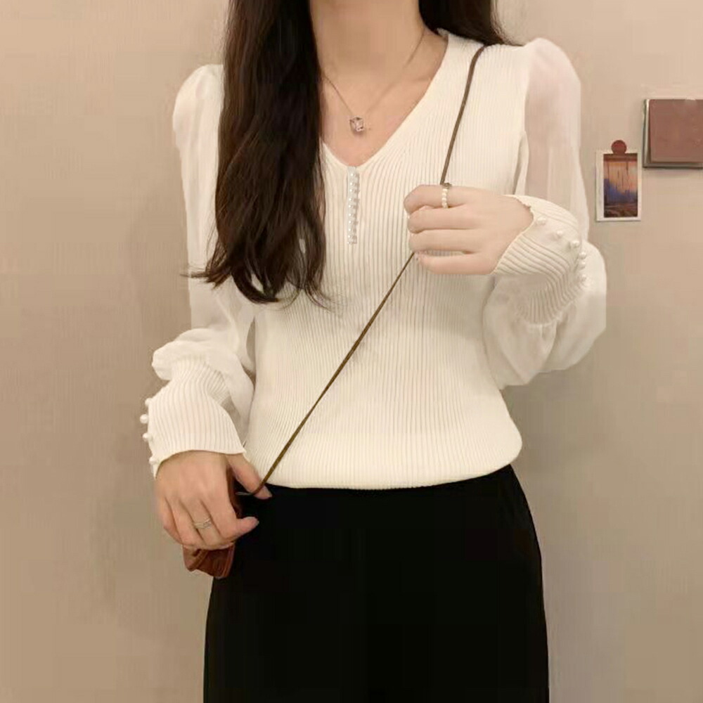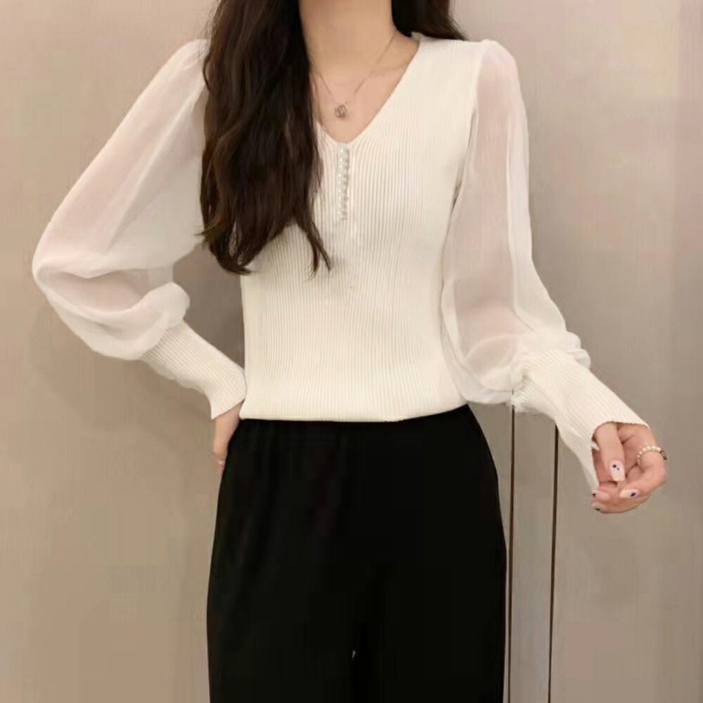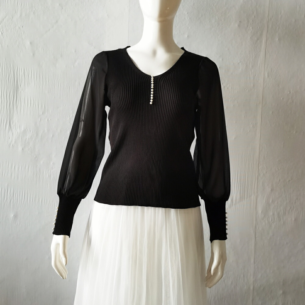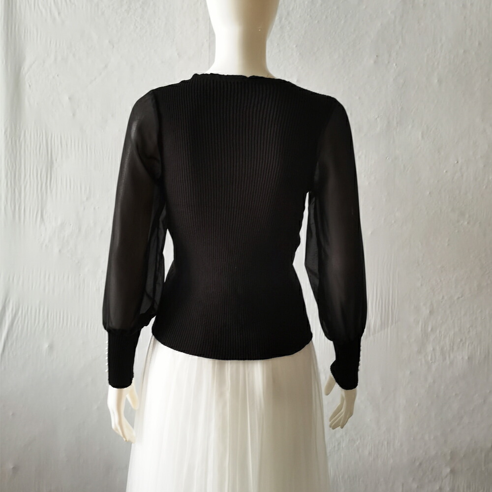 ニットトップス レディース シフォン袖 レディースファッション 豊富 ブラック ホワイト