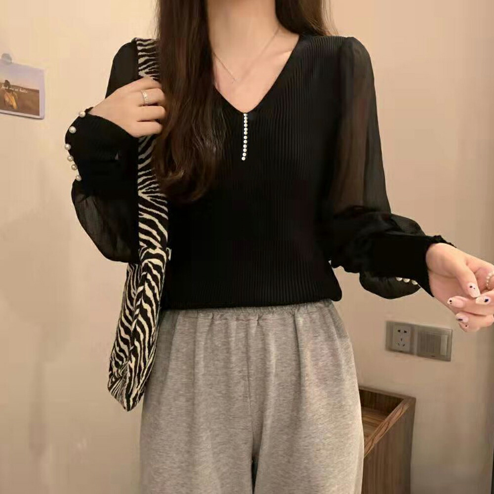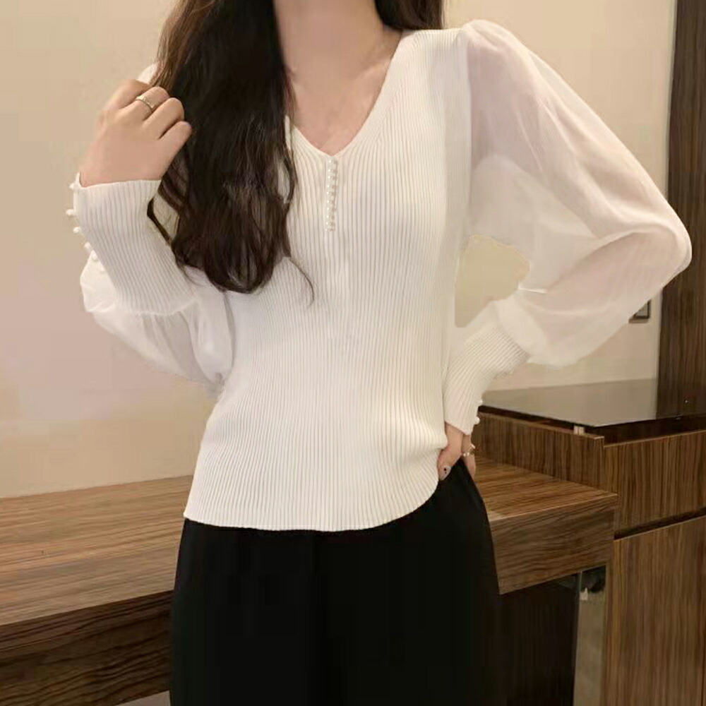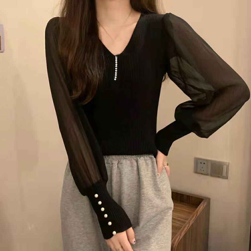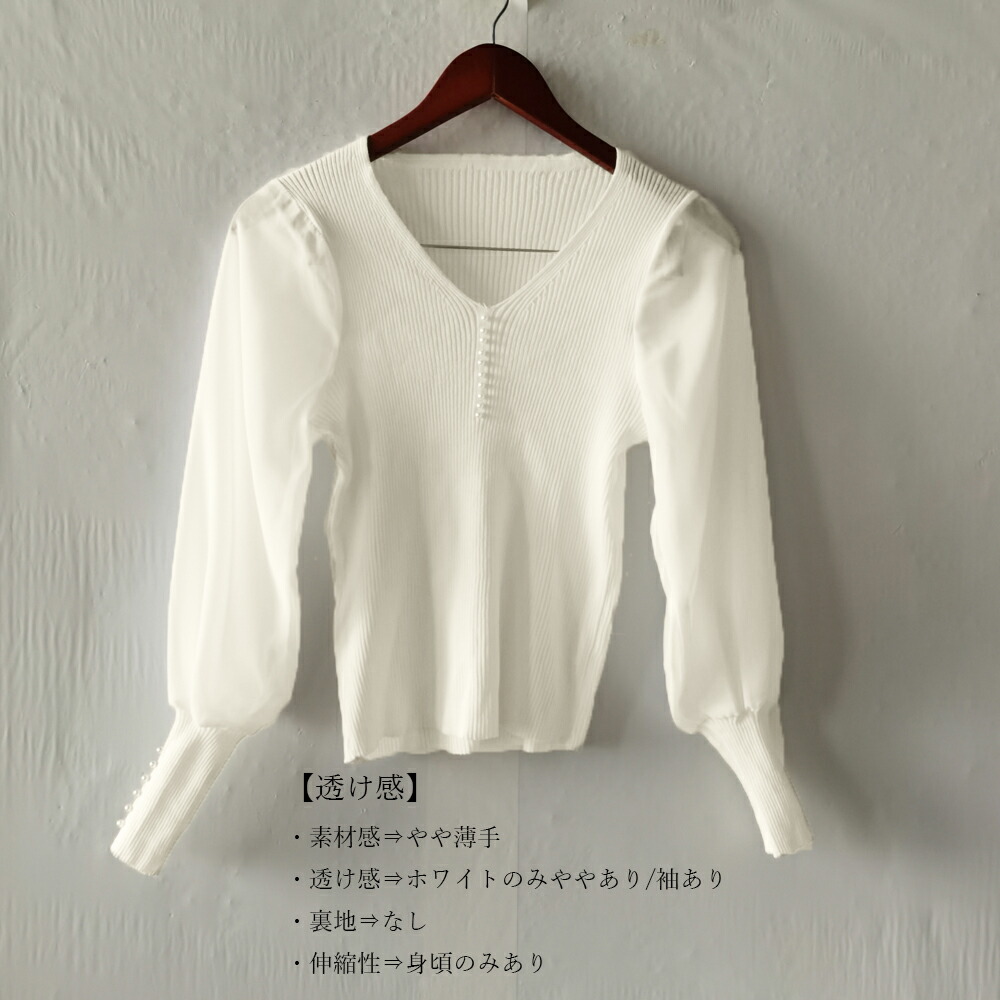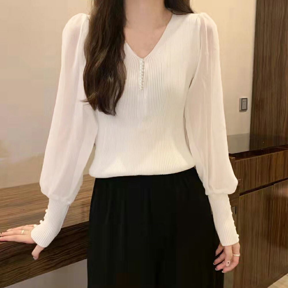 ニットトップス レディース シフォン袖 レディースファッション 豊富 ブラック ホワイト