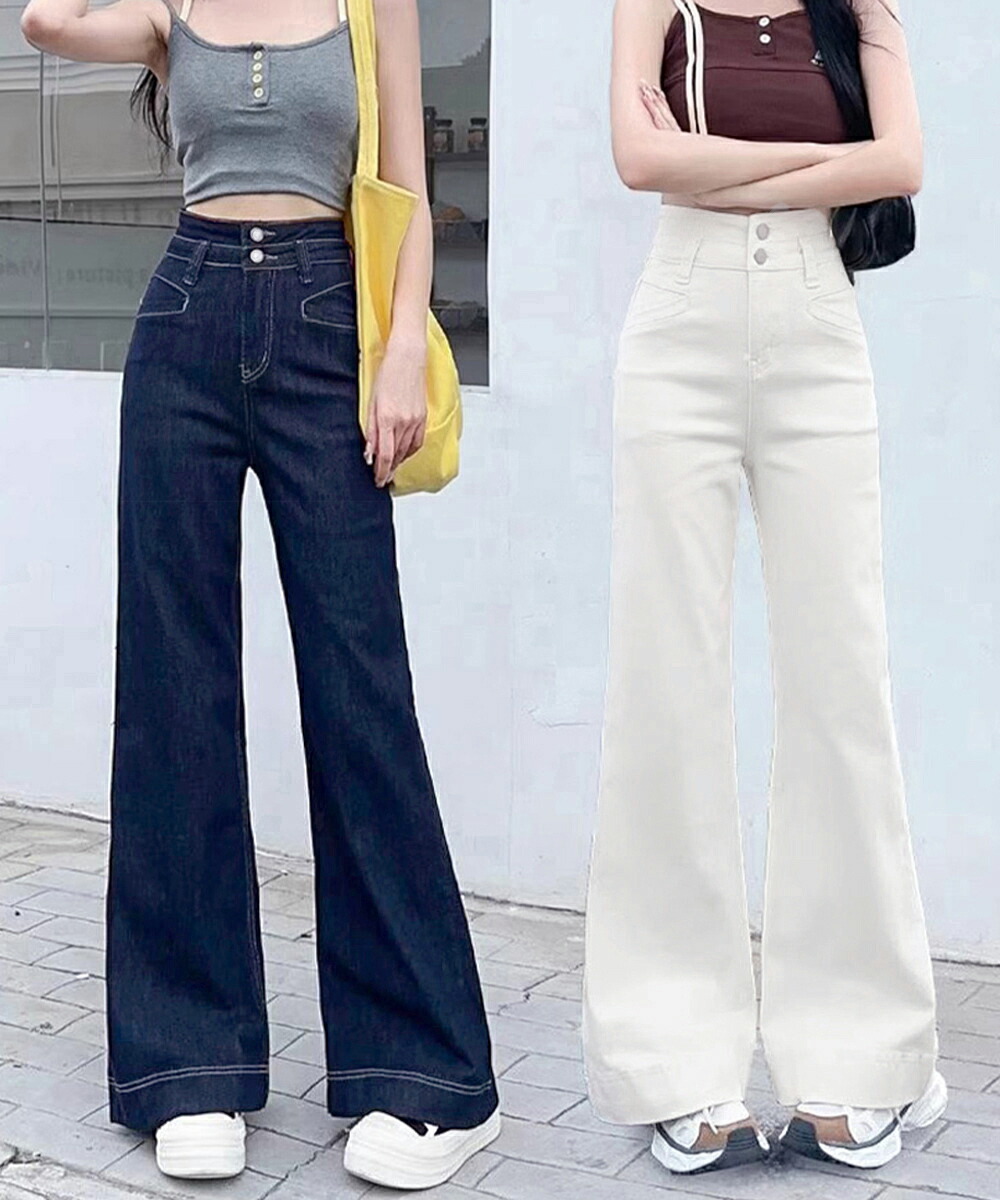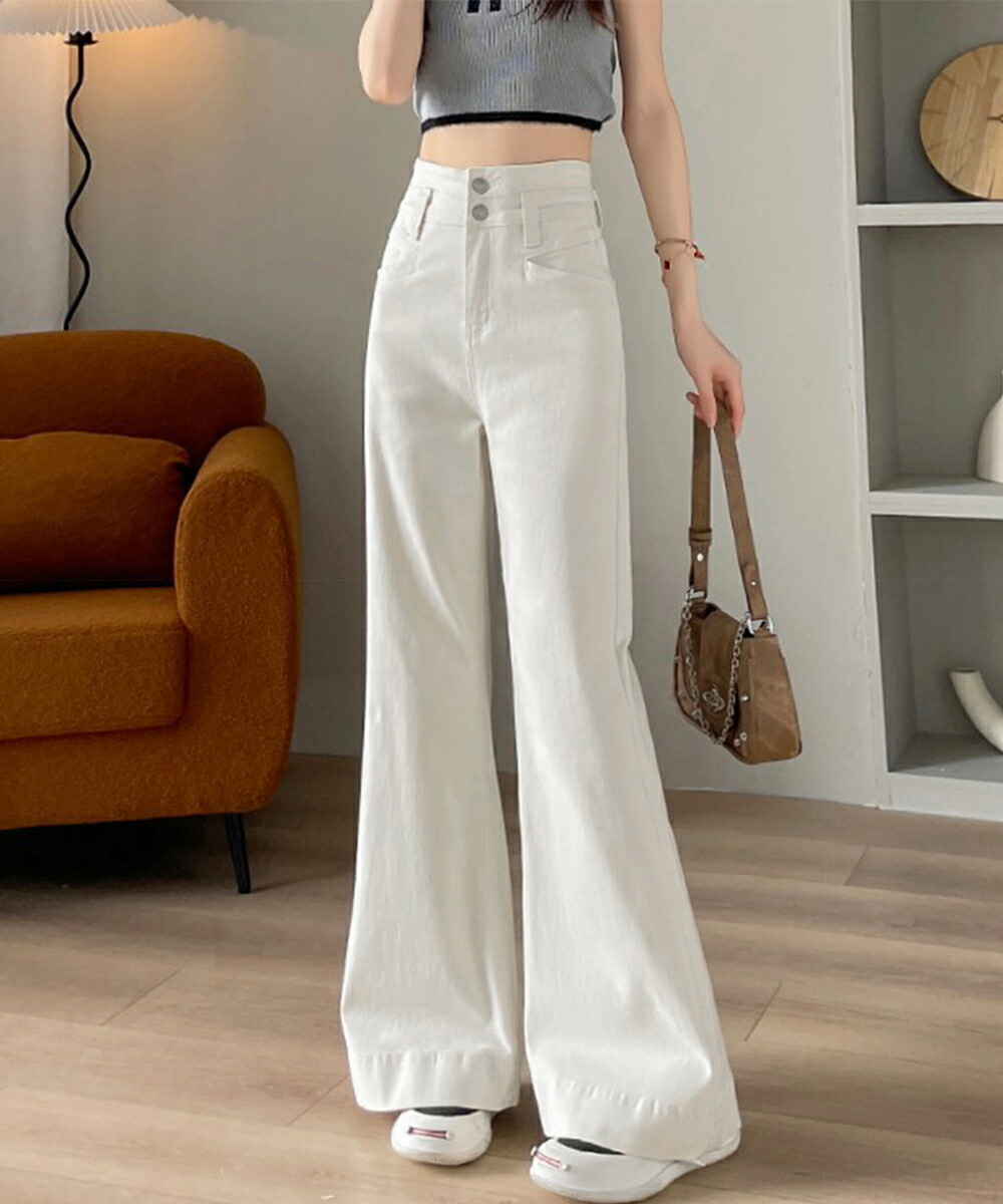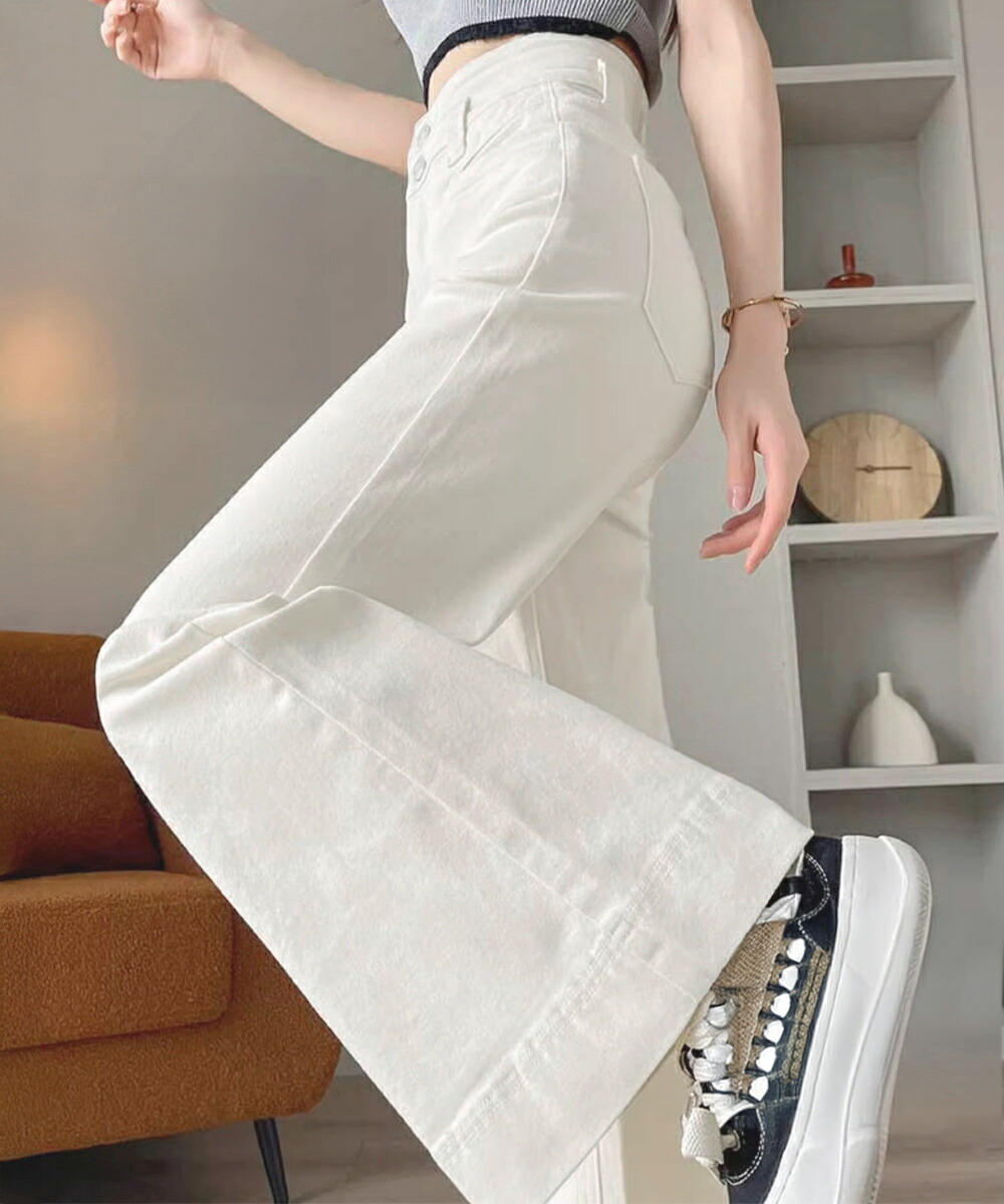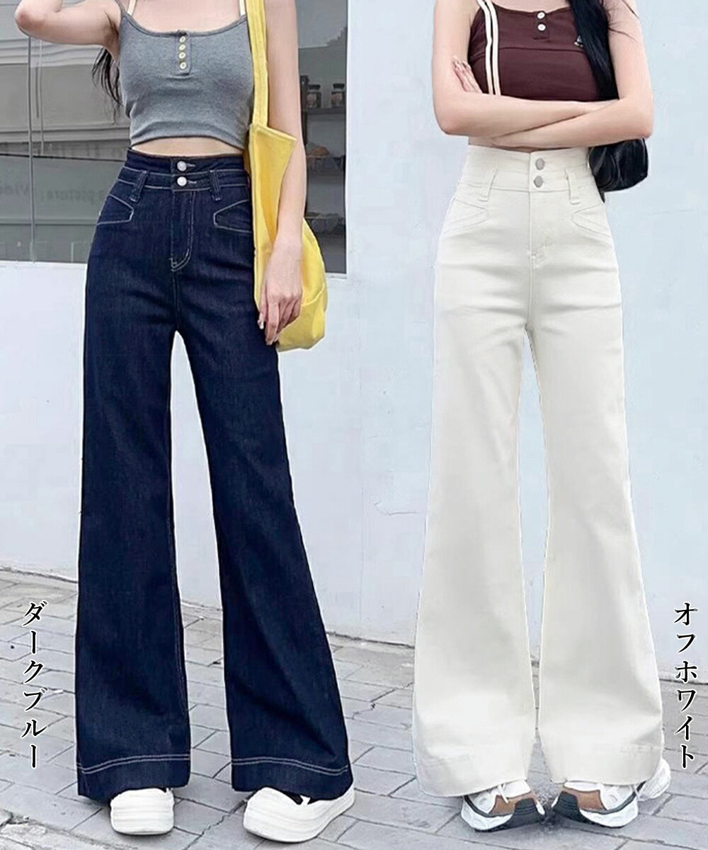 フレアデニムパンツ ハイウエスト美脚脚 ボトムス パンツ 続々登場 オフホワイト ダークブルー L M S XL