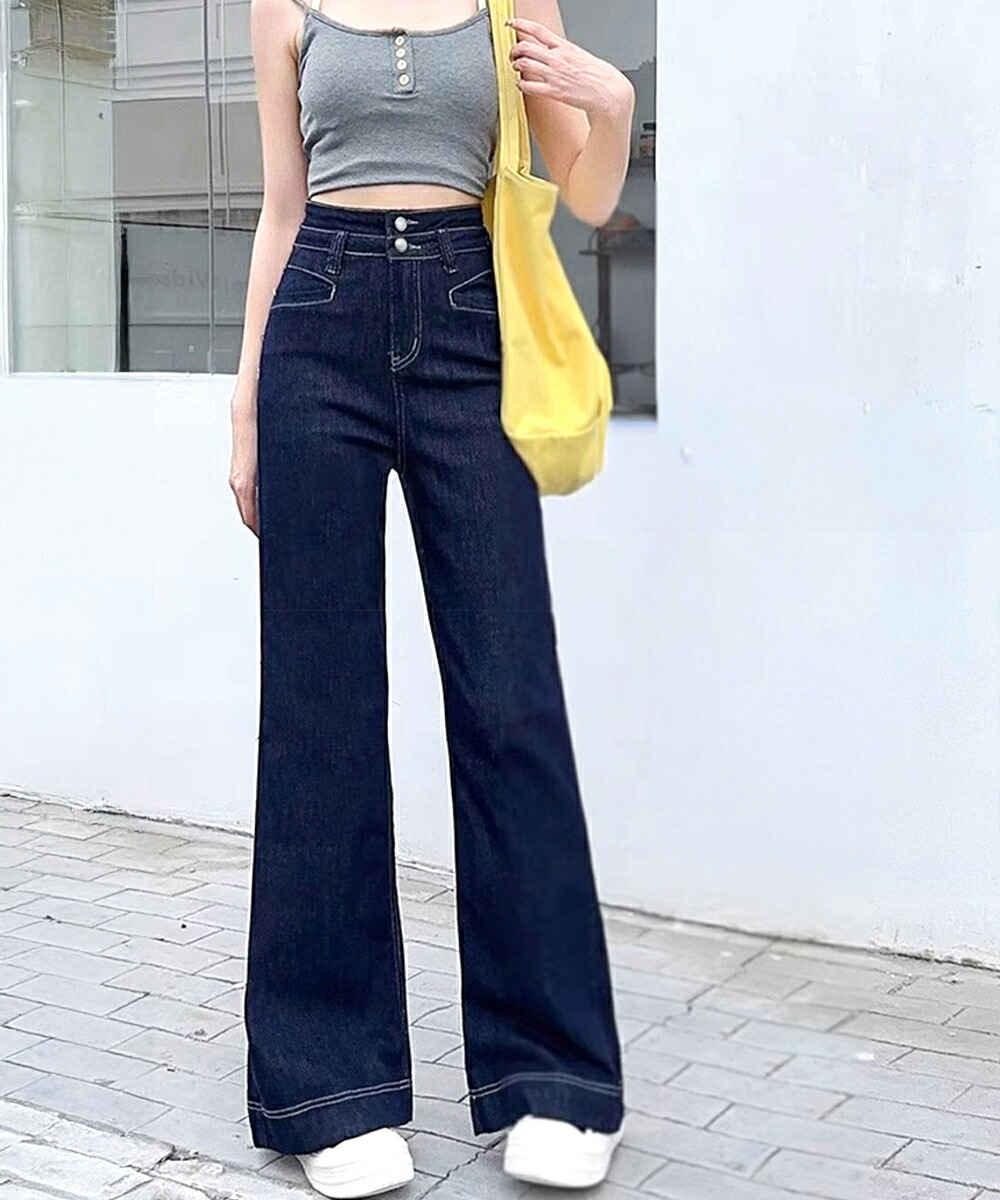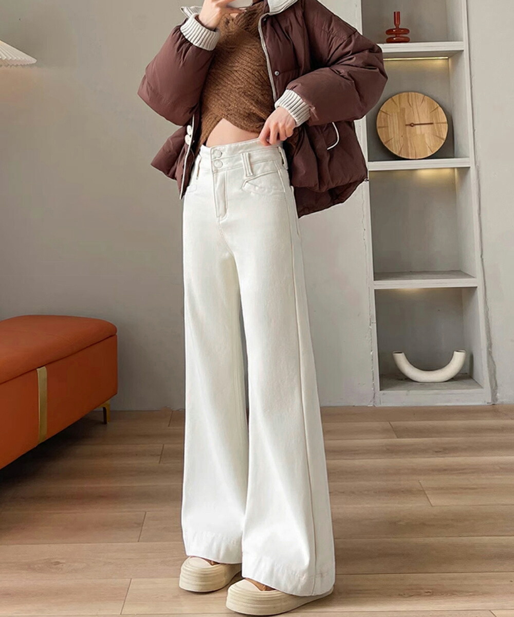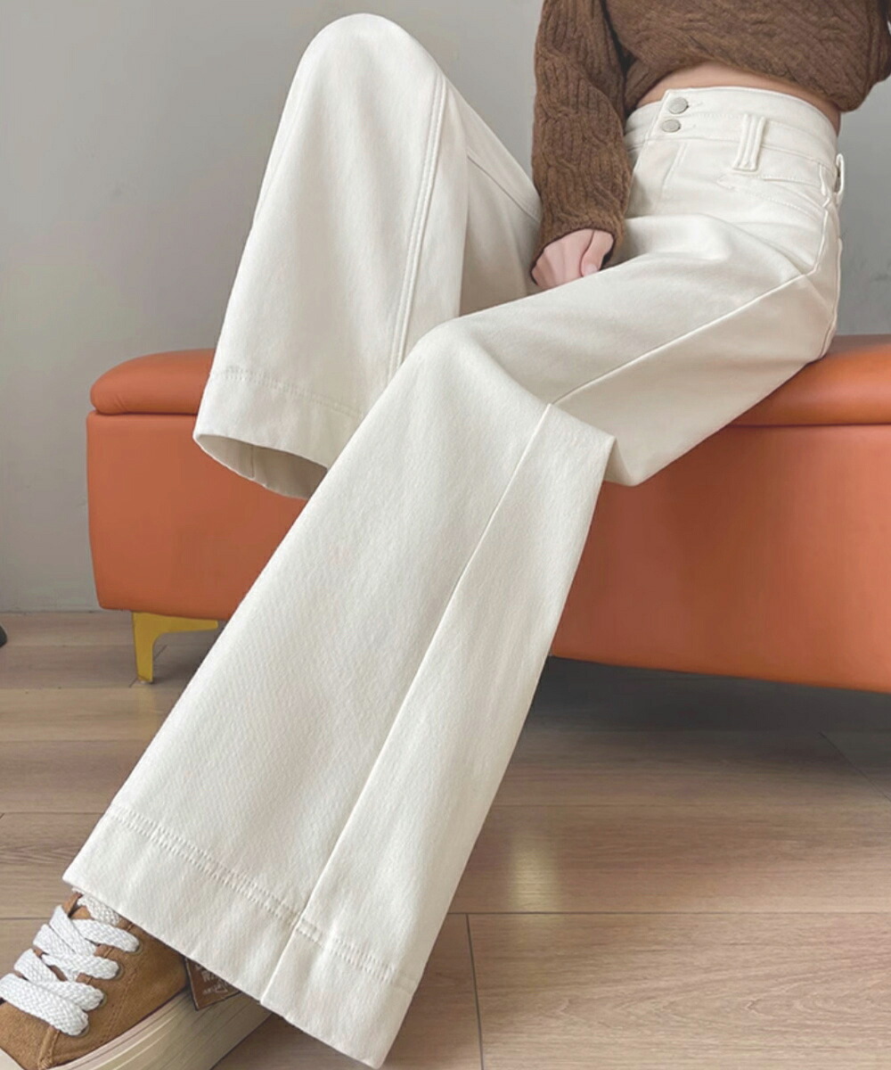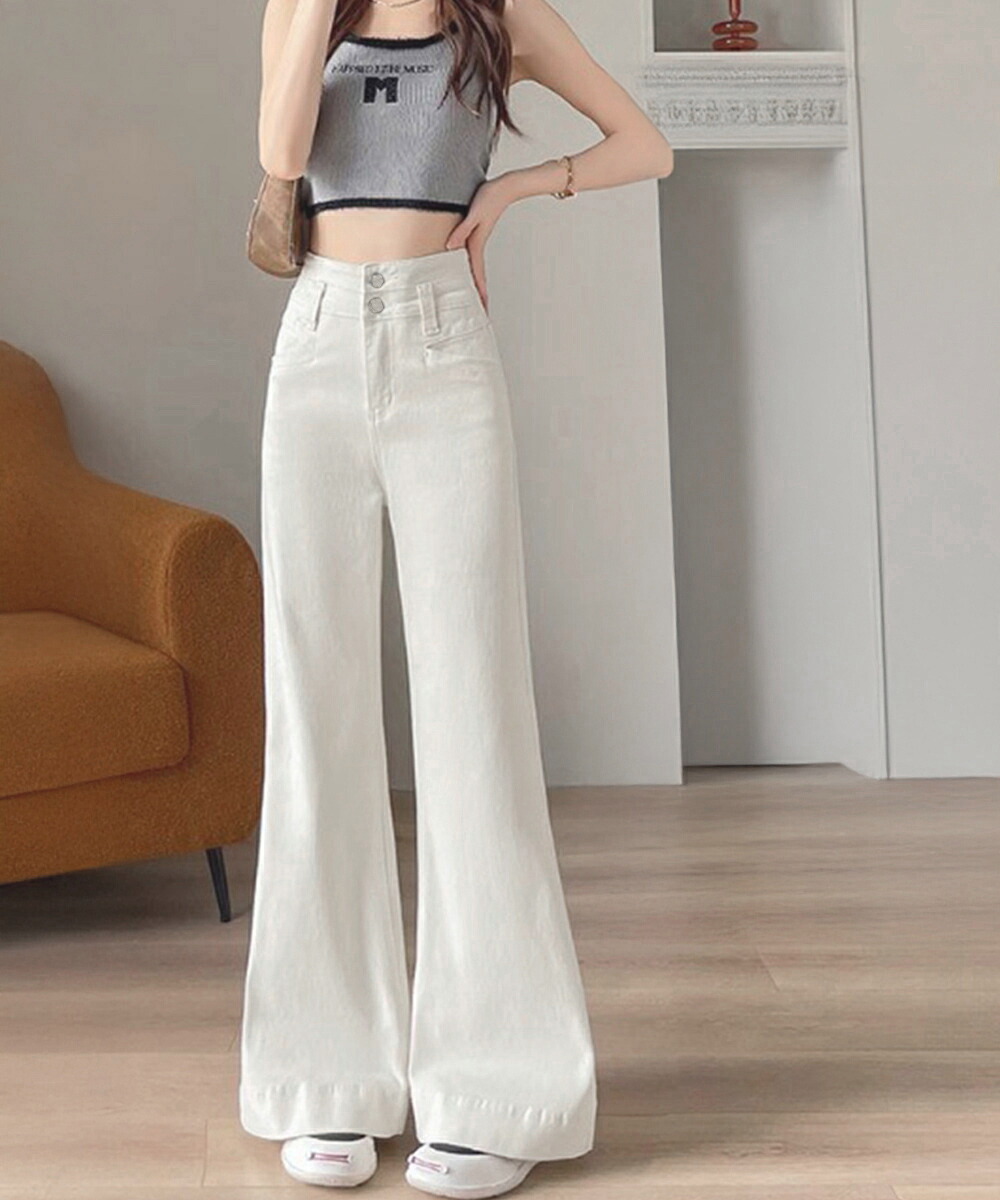 フレアデニムパンツ ハイウエスト美脚脚 ボトムス パンツ 続々登場 オフホワイト ダークブルー L M S XL