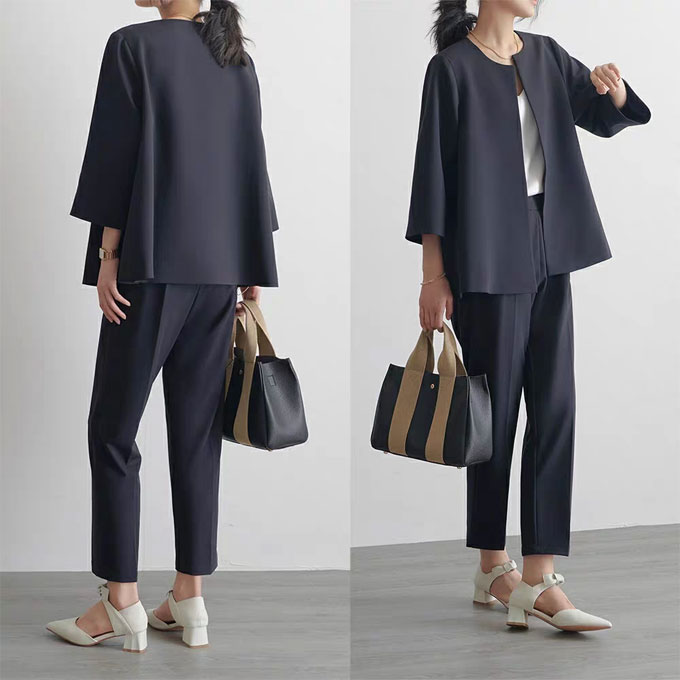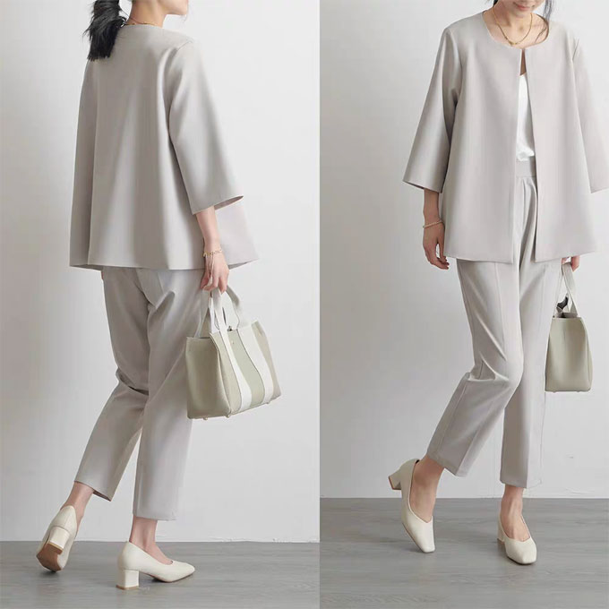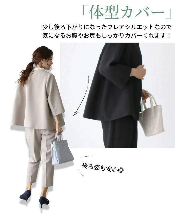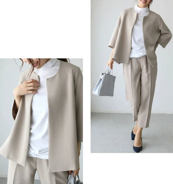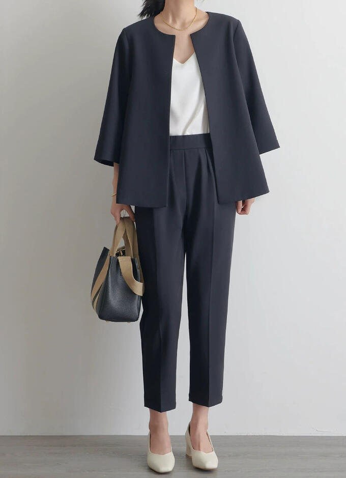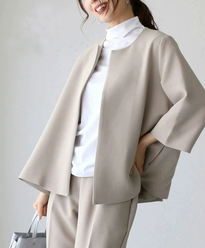 フレア感のあるシルエットとノーカラージャケットが堅さが無くて柔らかく女性らしい印象に!