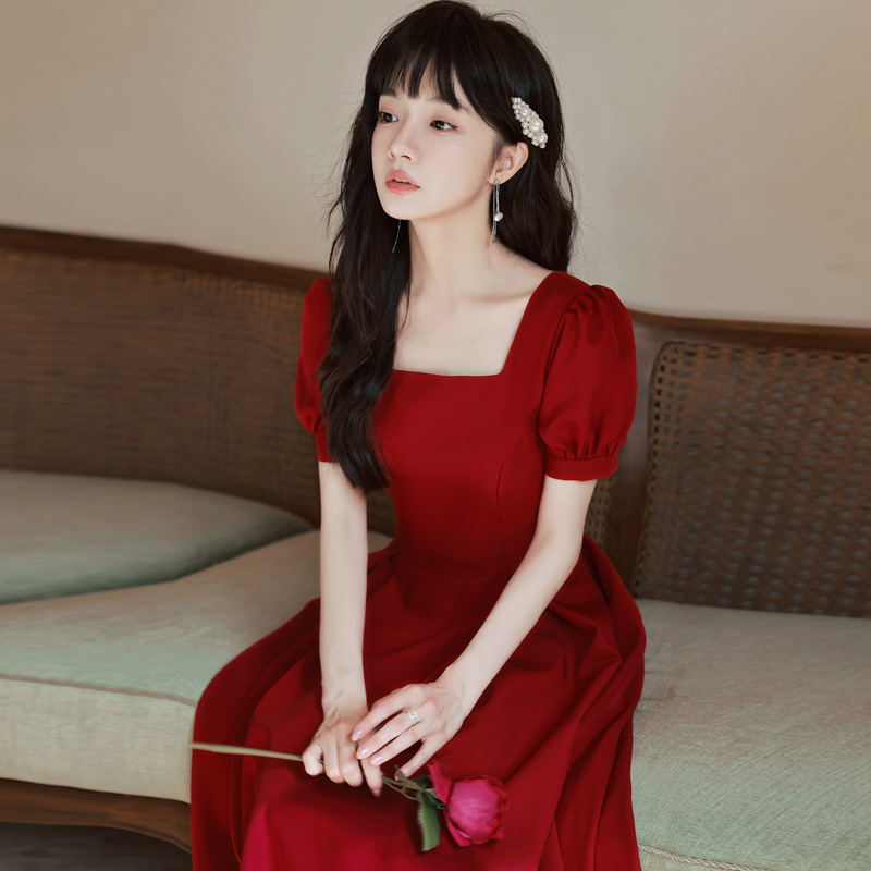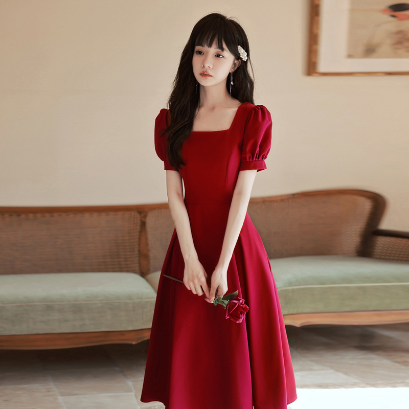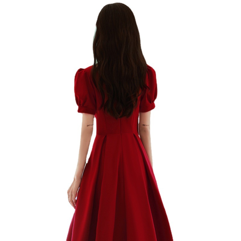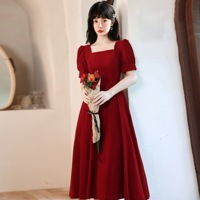 イブニングドレス ワイン赤 結婚式ドレス 二次会ドレス ロングドレス ワインレッド ゲストドレス パフスリーブ Vネック 発表会ドレス Aライン ロング丈 パーティードレス お呼ばれドレス 20代 30代 40代