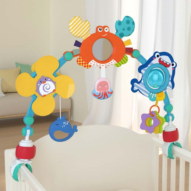 【カラフルなおもちゃで視覚の発達に役立つ】カラフルなカニなどが動物モチーフおもちゃがたくさんついたメリーは、赤ちゃんの視覚を刺激し、視力の発達に良い影響を与えてくれます