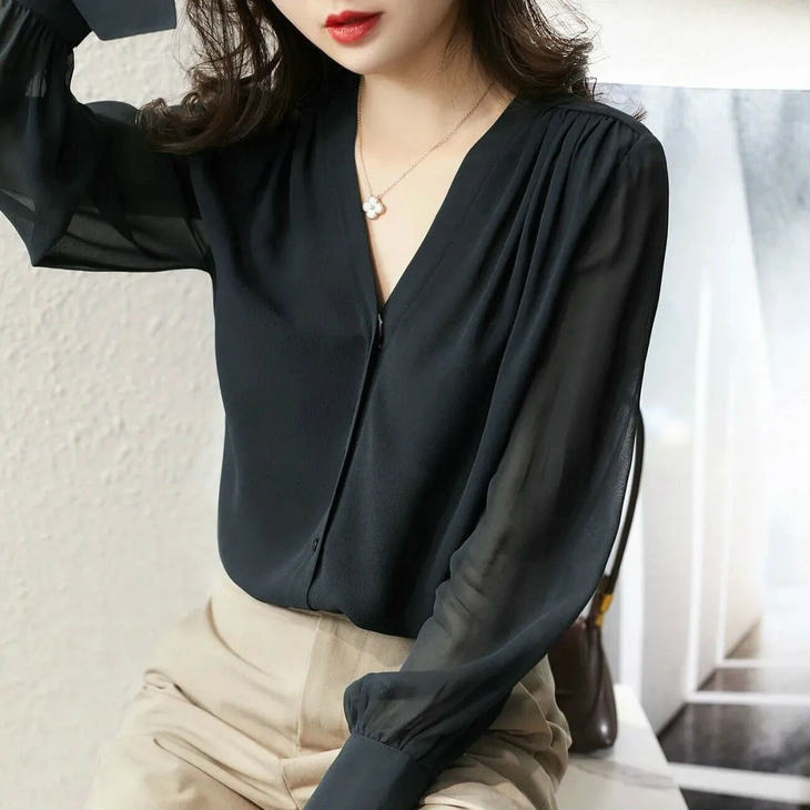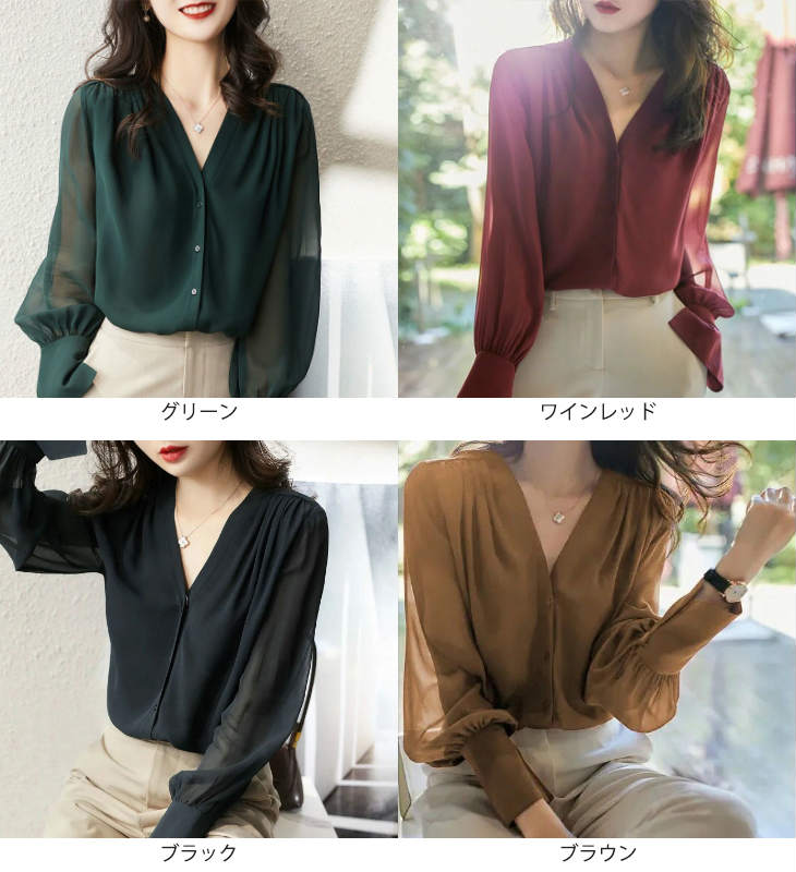 クーポン! レディース ブラウス Vネック ロングシャツ 長袖シャツ ロングスリーブ トップス カジュアル 大人可愛い 透け感 きちんと感 きれいめ 上品 エレガント おしゃれ オフィス グリーン ワインレッド ブラック ブラウン