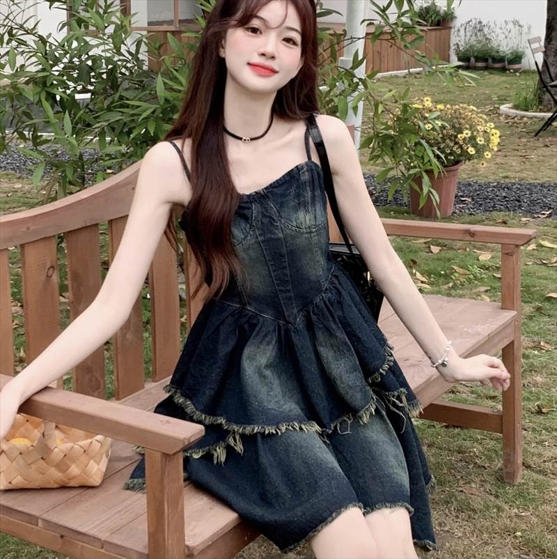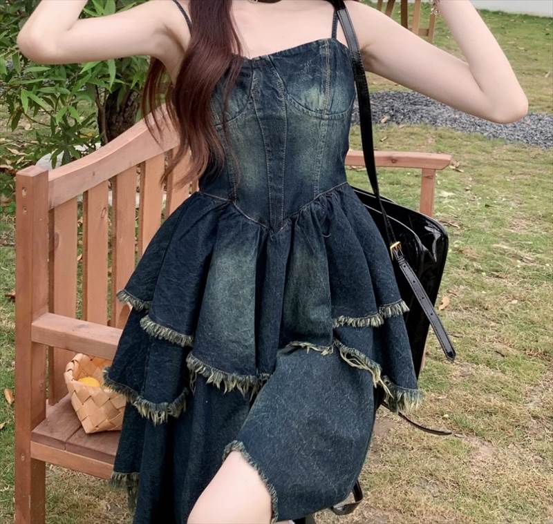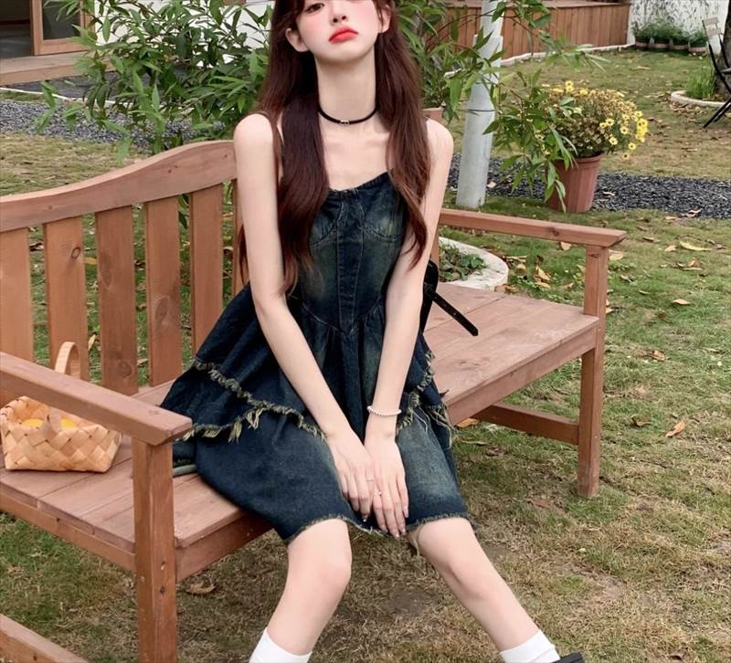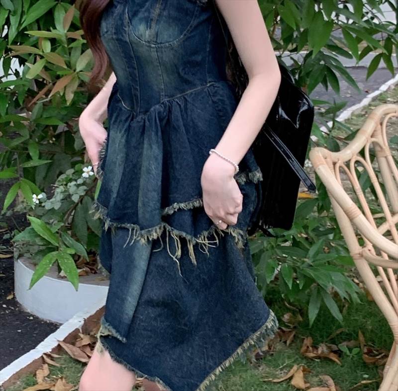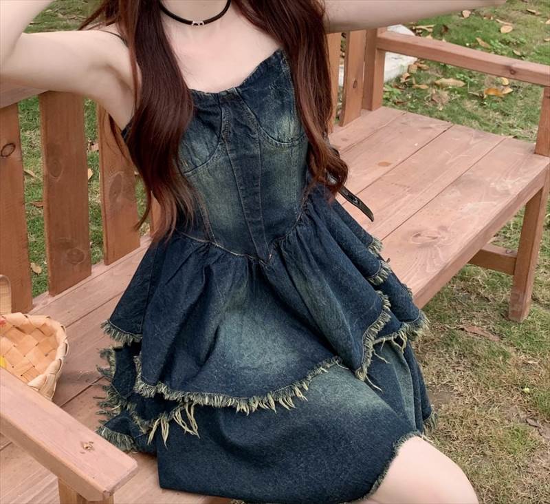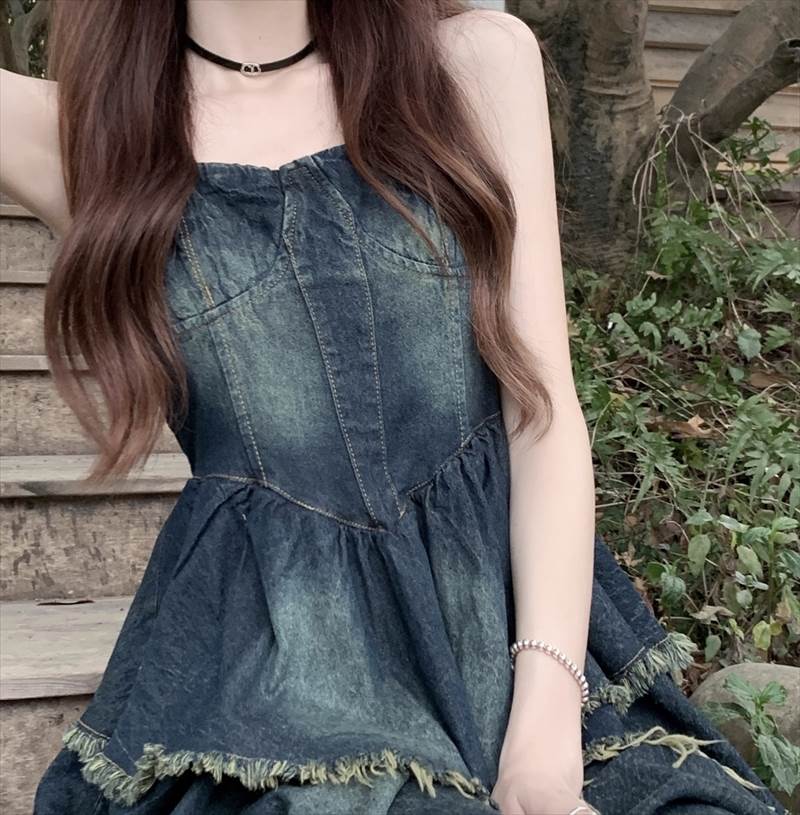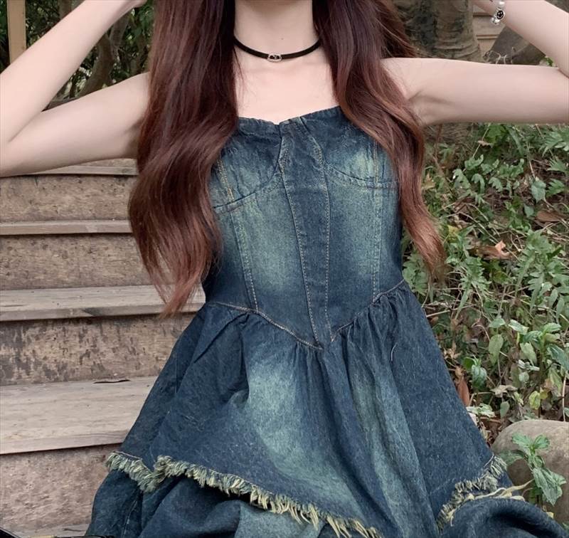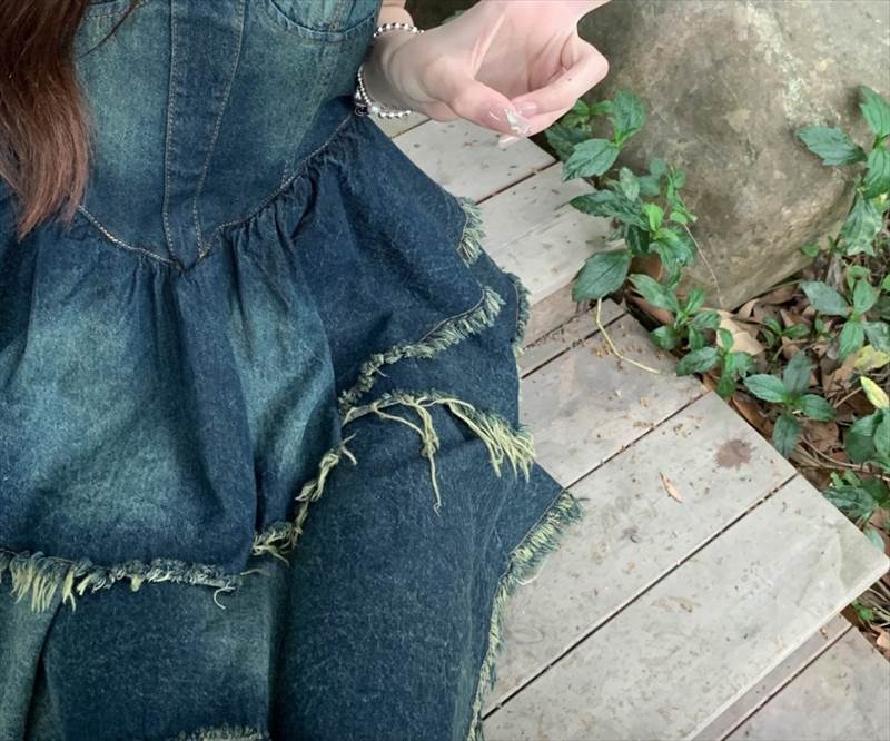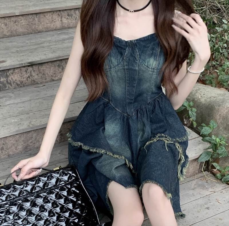 ワンピース キャミワンピ デニム ショート丈 ノースリーブ チューブトップ フリル ネイビー かわいい 大人可愛い シンプル カジュアル おしゃれ レトロ ラフ ルーズ クール モード系 ワンピース 夏 OL 学生 デート イベント