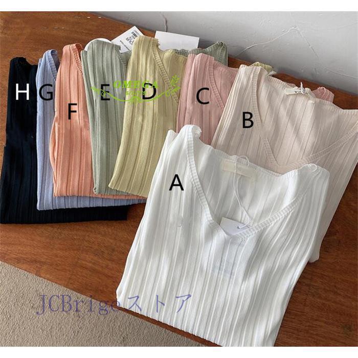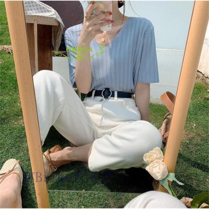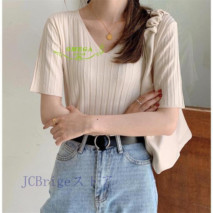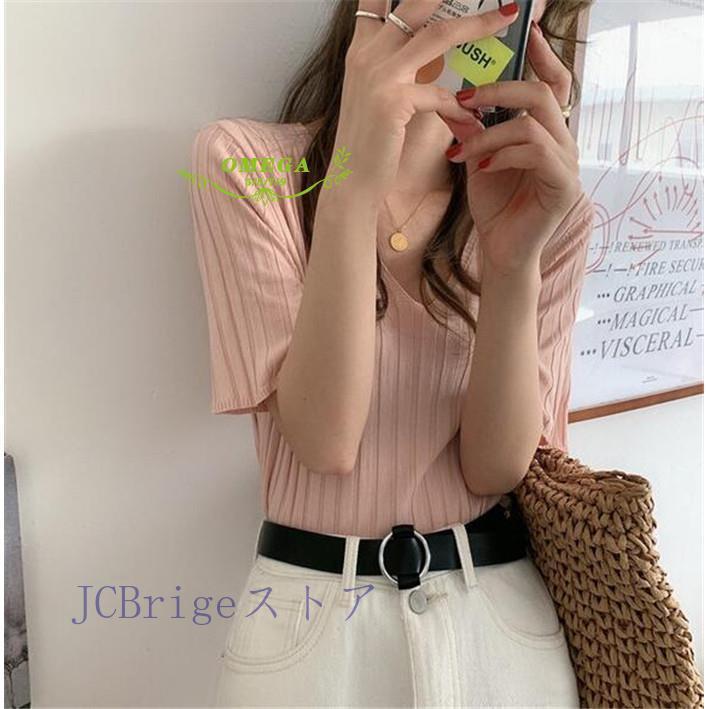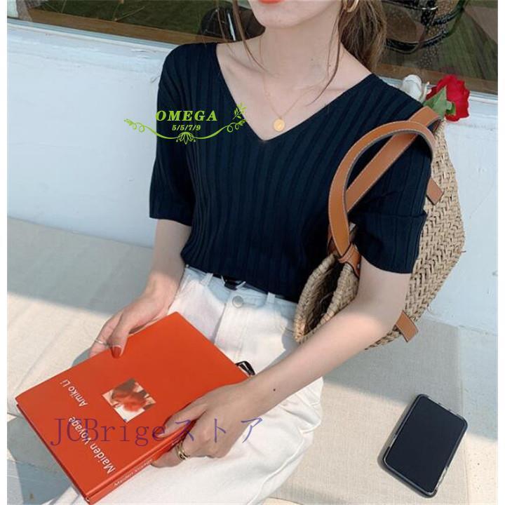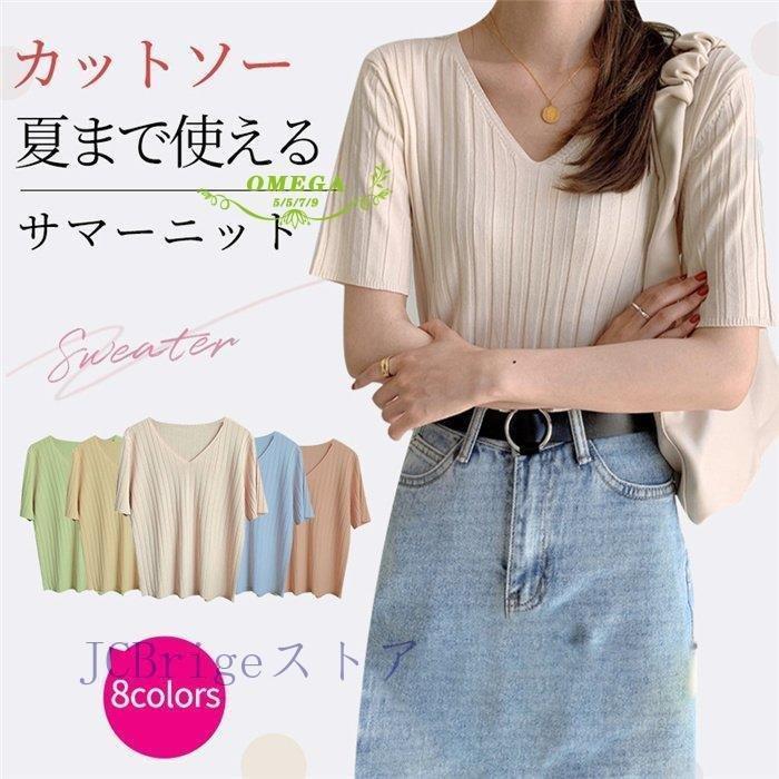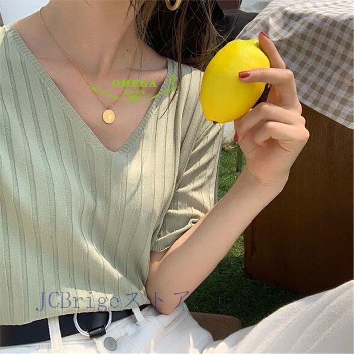 サマーニット Vネック 半袖 無地 シ トップス Tシャツ カットソー 特集 オレンジ ブルー ブラック イエロー ベージュ グーリン ホワイト ピンク