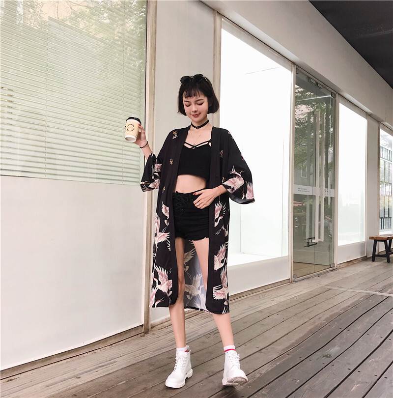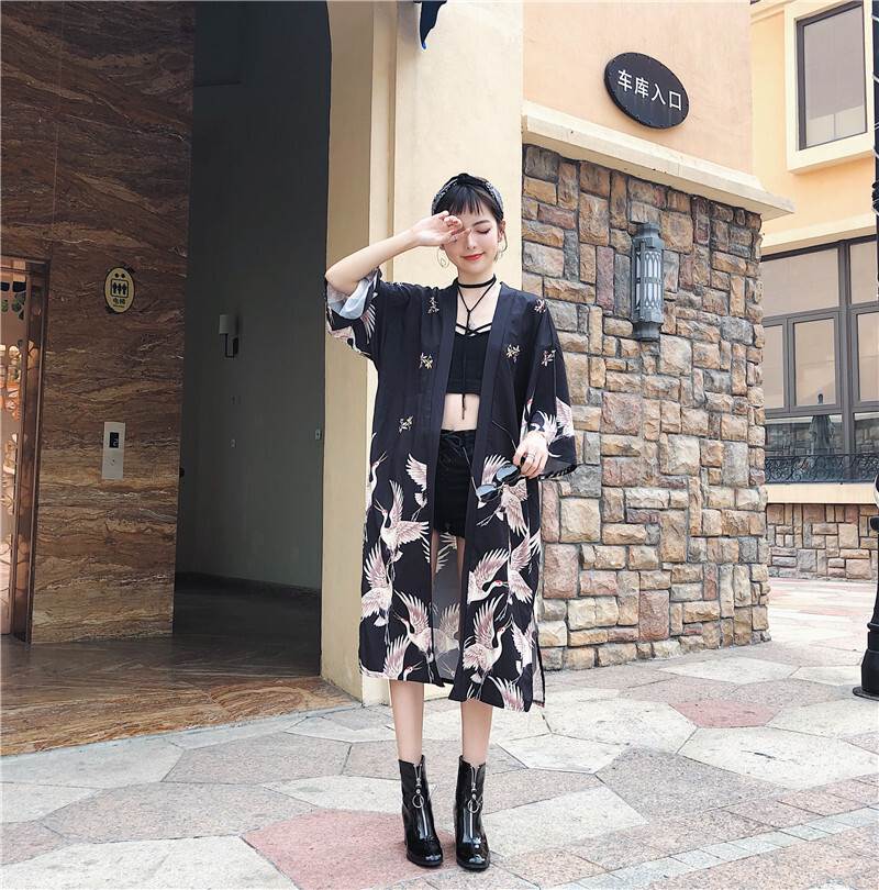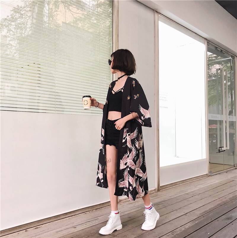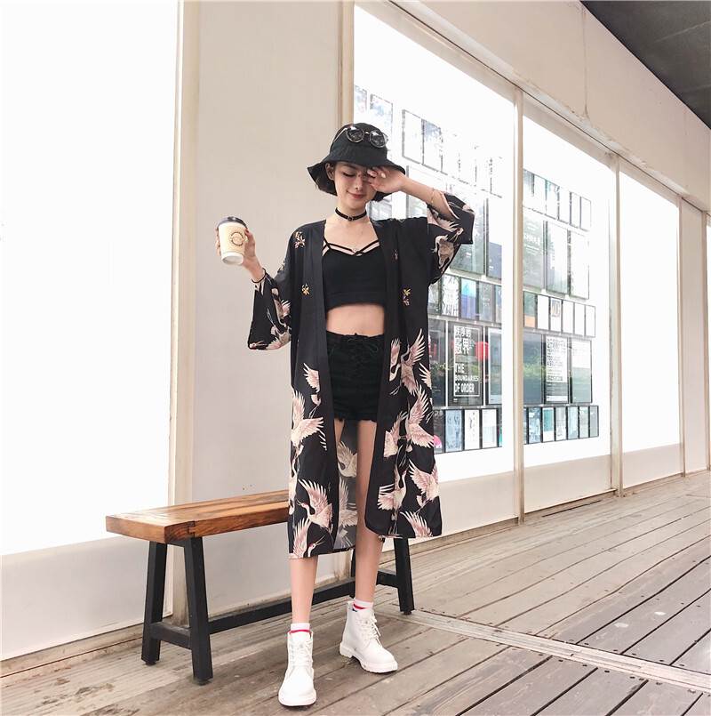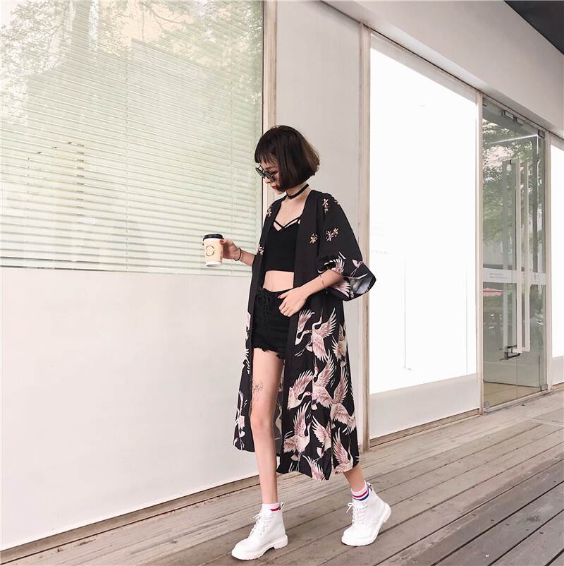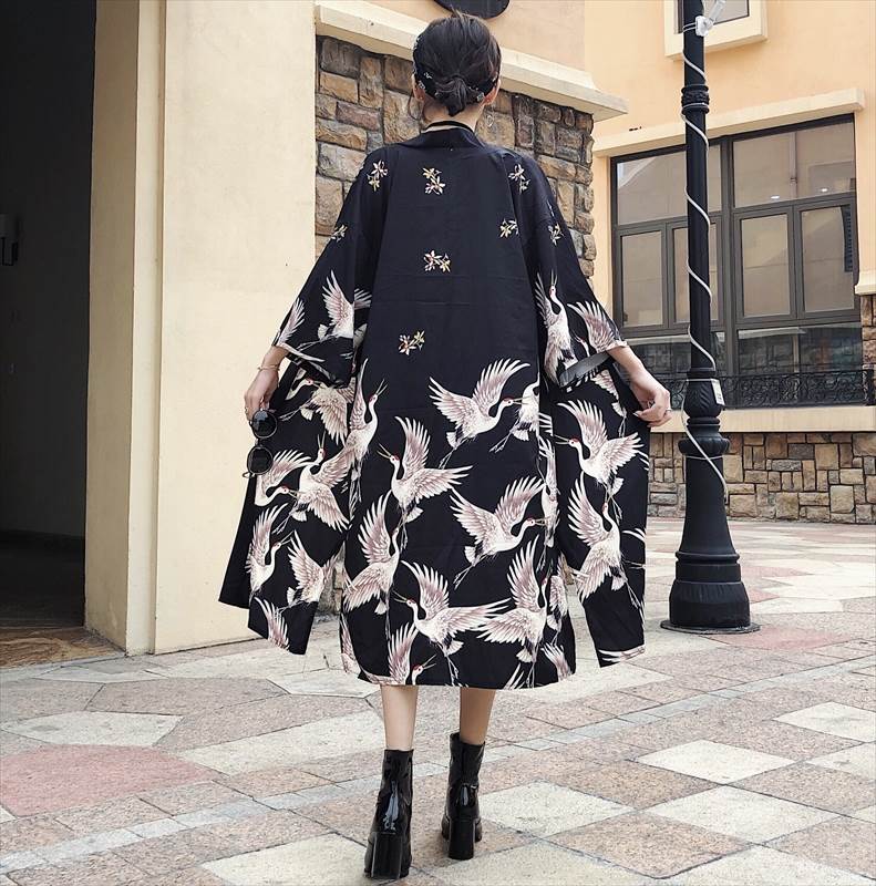 着物風 和柄 羽織 カーディガン シャツ ガウン 帯ベルト 可愛い ロング レディース 七分袖 長袖 鶴 主役級 薄手 スリット ウエストベルト プリント 夏 ポリエステル カジュ 大人可愛い 韓国 オルチャン 個性的 デザイン おしゃれ トップス