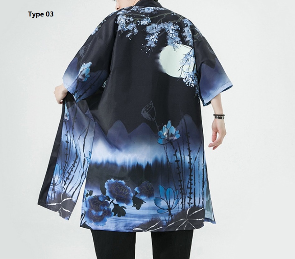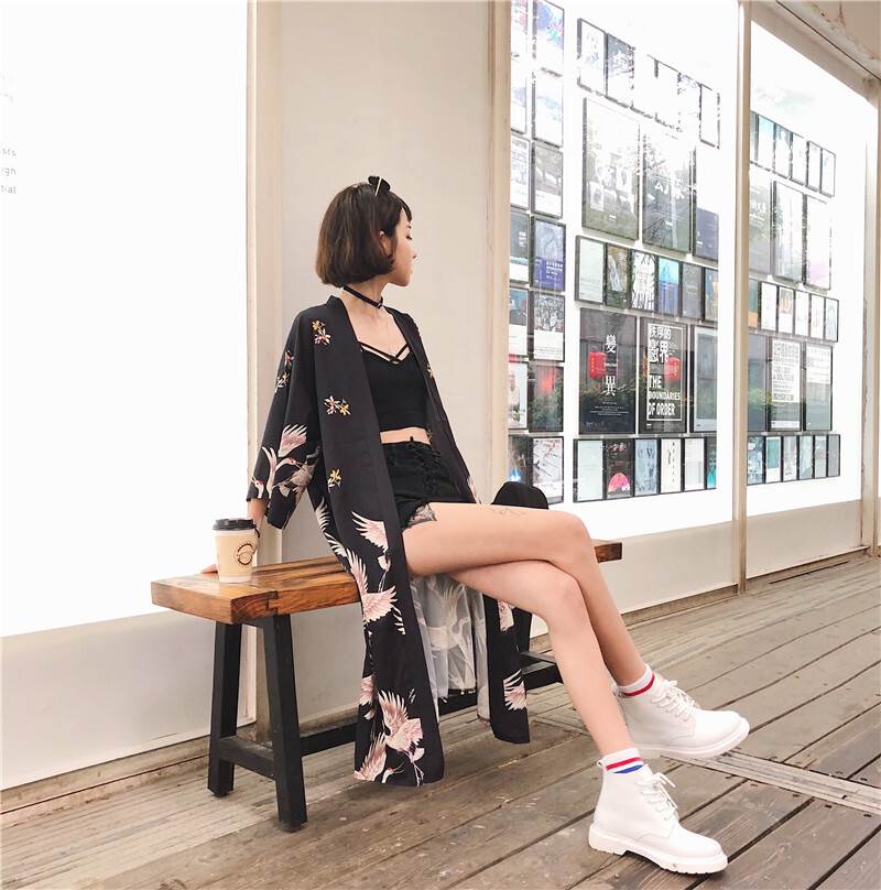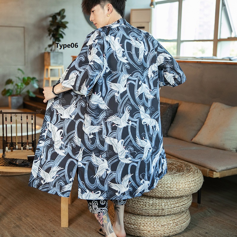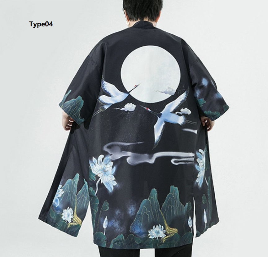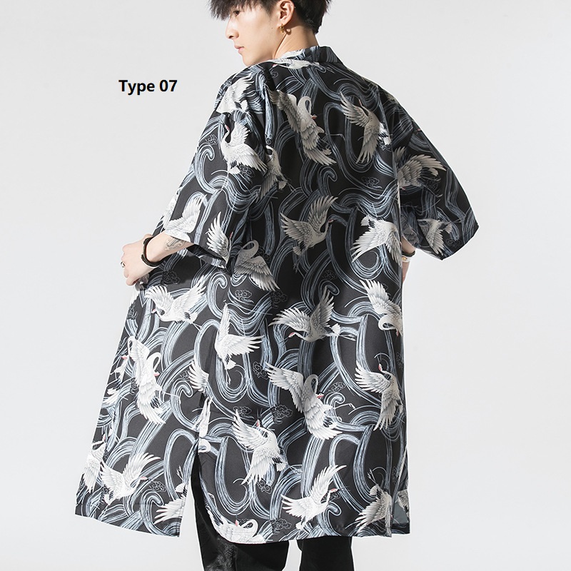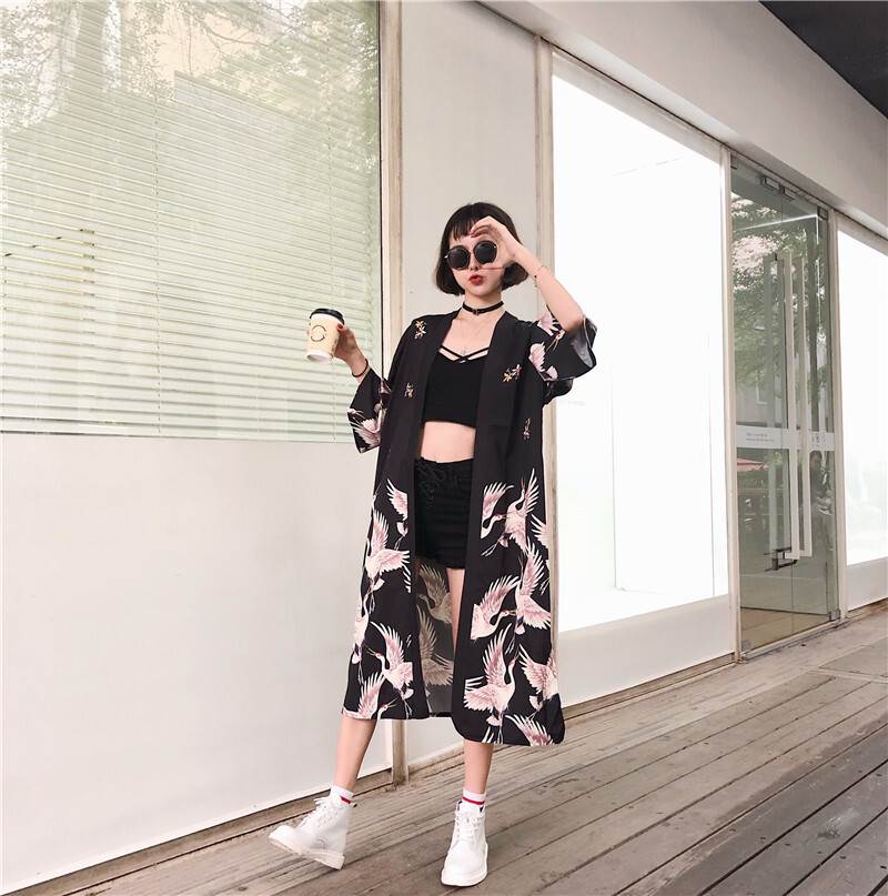 着物風 和柄 羽織 カーディガン シャツ ガウン 帯ベルト 可愛い ロング レディース 七分袖 長袖 鶴 主役級 薄手 スリット ウエストベルト プリント 夏 ポリエステル カジュ 大人可愛い 韓国 オルチャン 個性的 デザイン おしゃれ トップス