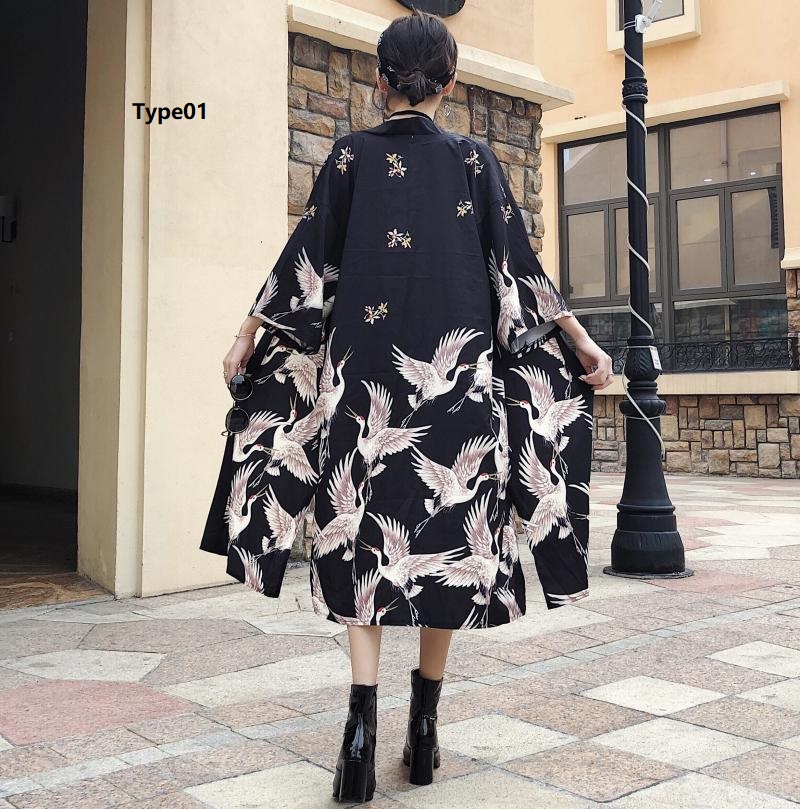 着物風 トップス 和柄 羽織 カーディガン シャツ ガウン 帯ベルト 可愛い ロング レディース 七分袖 長袖 鶴 主役級 薄手 スリット ウエストベルト プリント 夏 ポリエステル カジュ 大人可愛い 韓国 オルチャン 個性的 デザイン おしゃれ