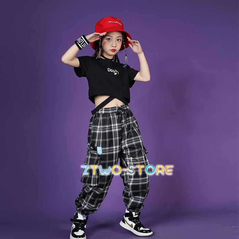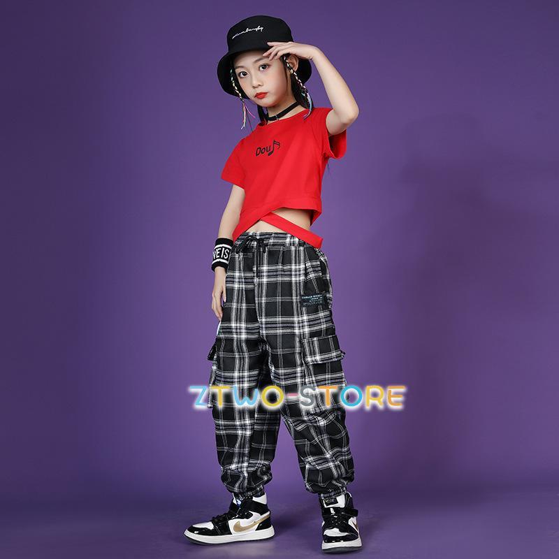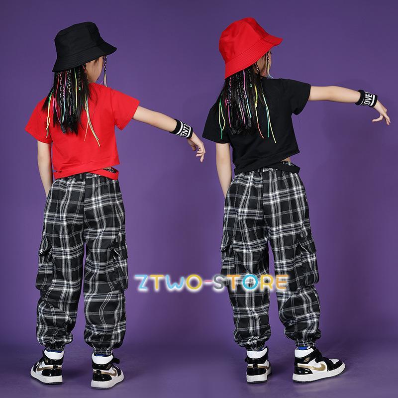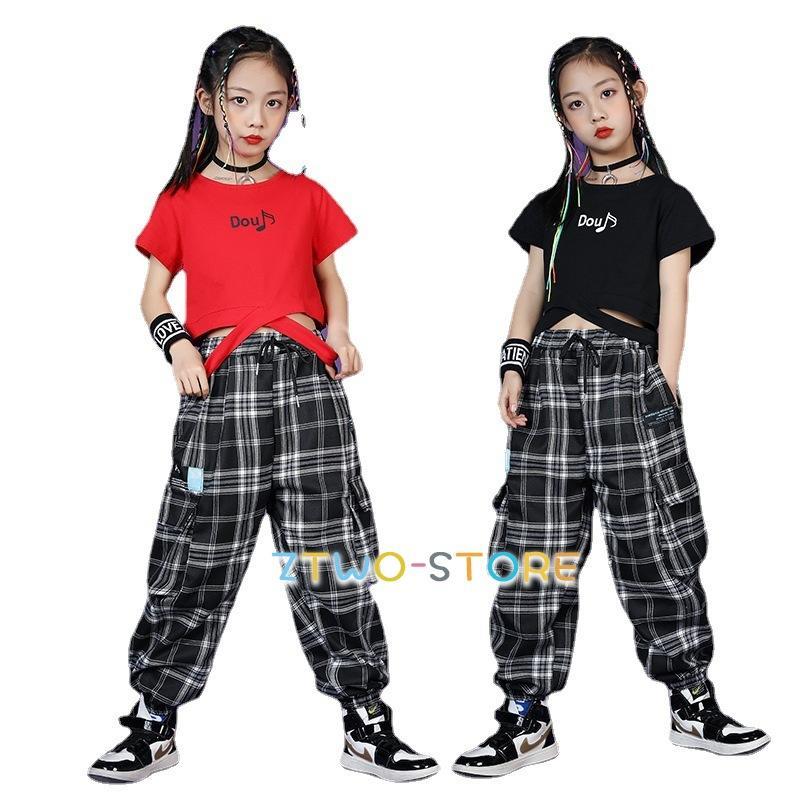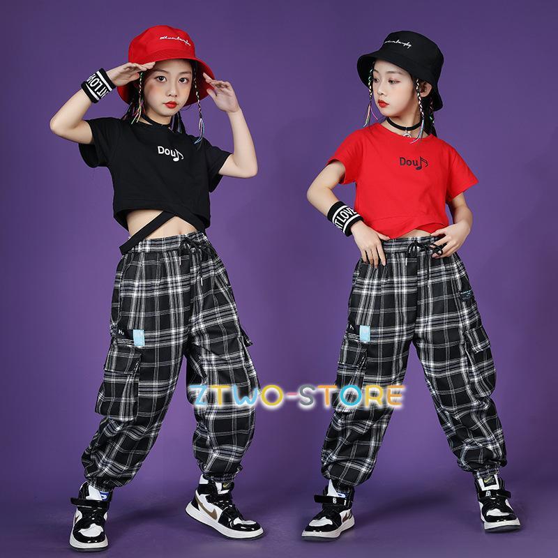 キッズダンス衣装 チェック柄 へそ出し トップス Tシャツ カットソー 人気 黒-シャツのみ 赤-シャツのみ パンツのみ;770 赤シャツ+パンツ;2300 黒シャツ+パンツ;2300 120cm 130cm 140cm 150cm 160cm 170cm