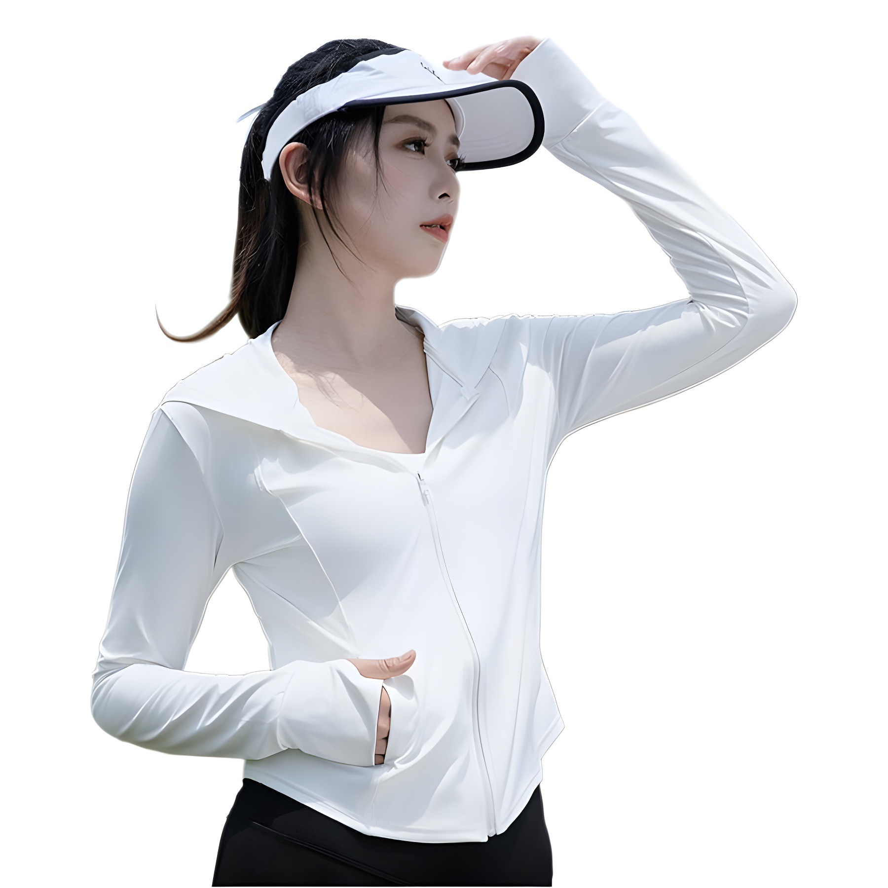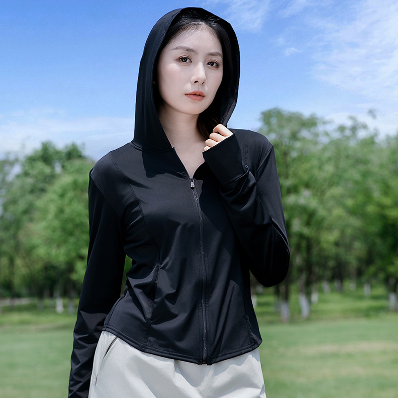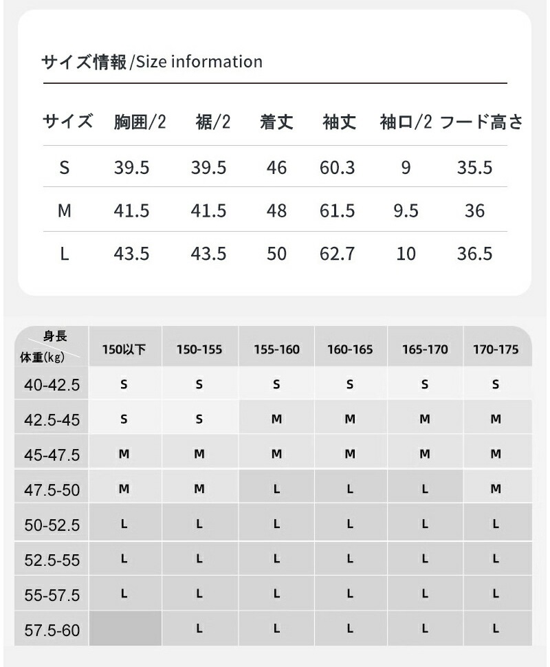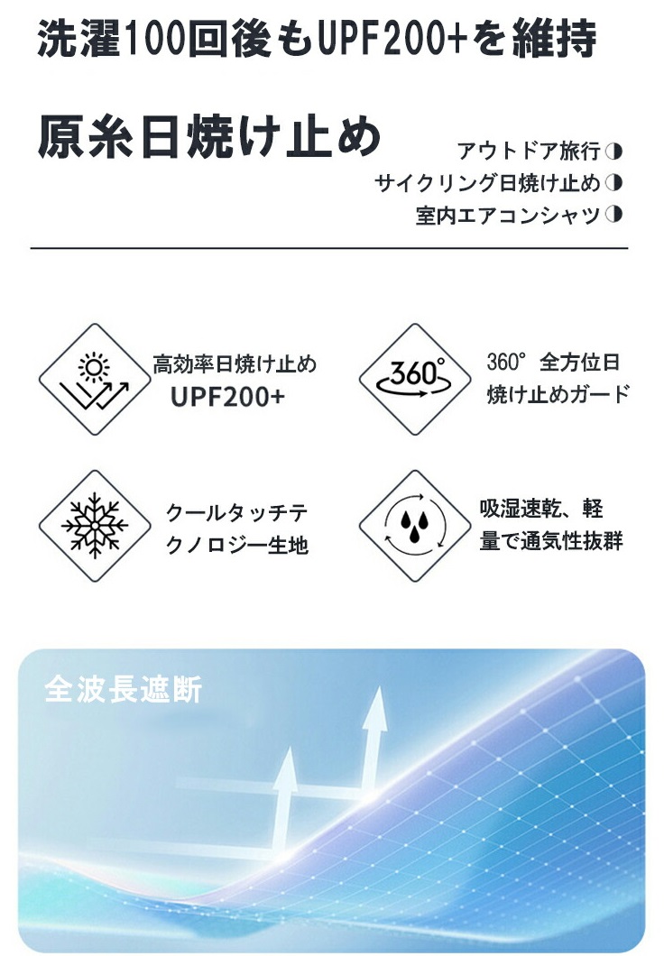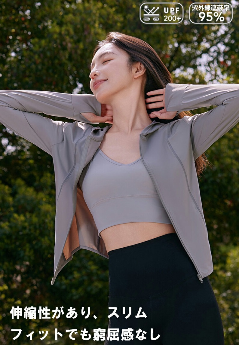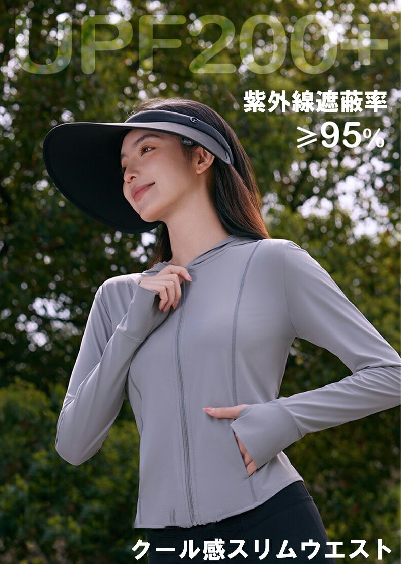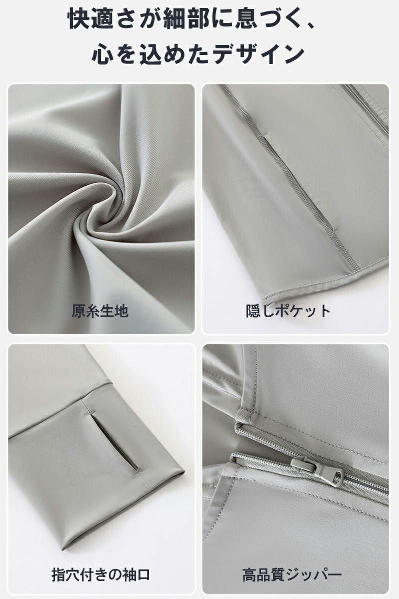 機能特性 接触冷感、紫外線対策、軽量、スリムシルエット、調節可能フード、指穴付き袖口