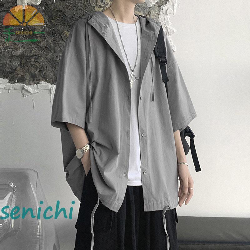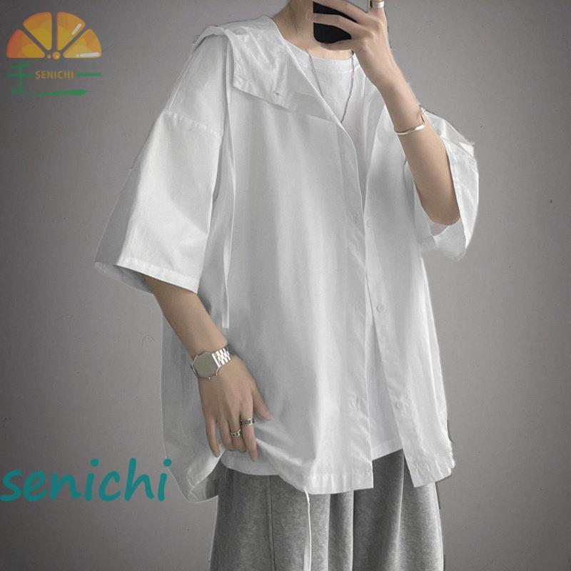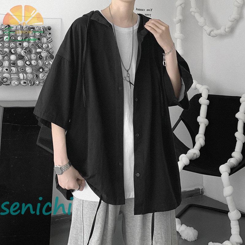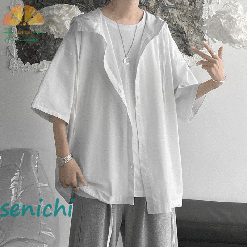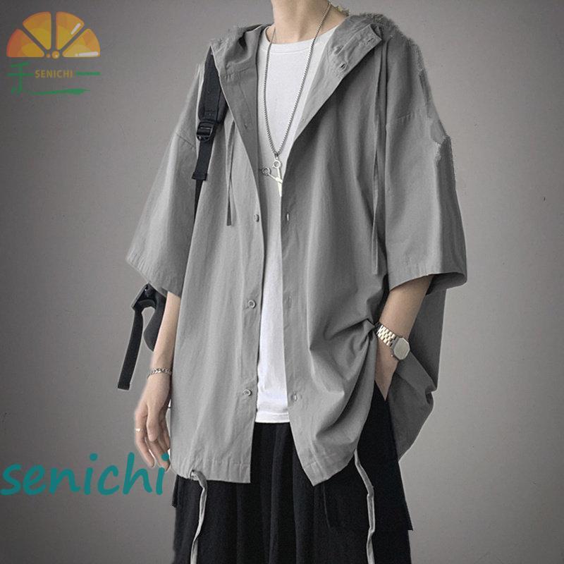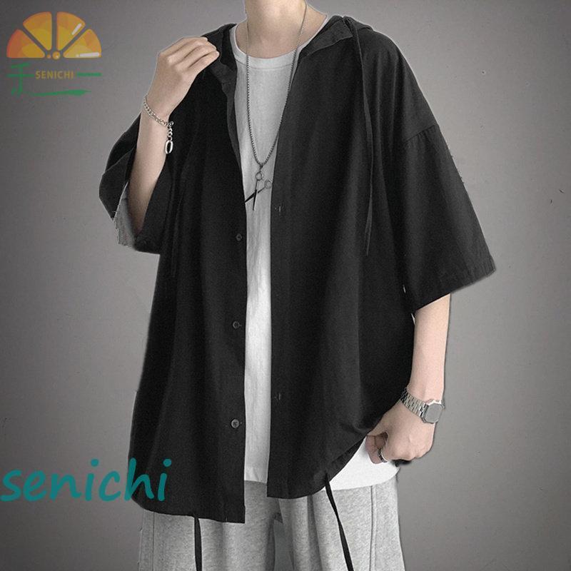 パーカー 七分袖シャツ メンズ 無地 開襟シャツ 半袖 カジュアルシャツ トップス フード付き 父の日 通学 お出かけ おしゃれ オーバーサイズ 体型カバー