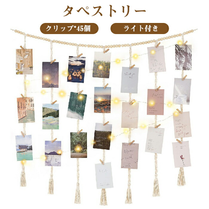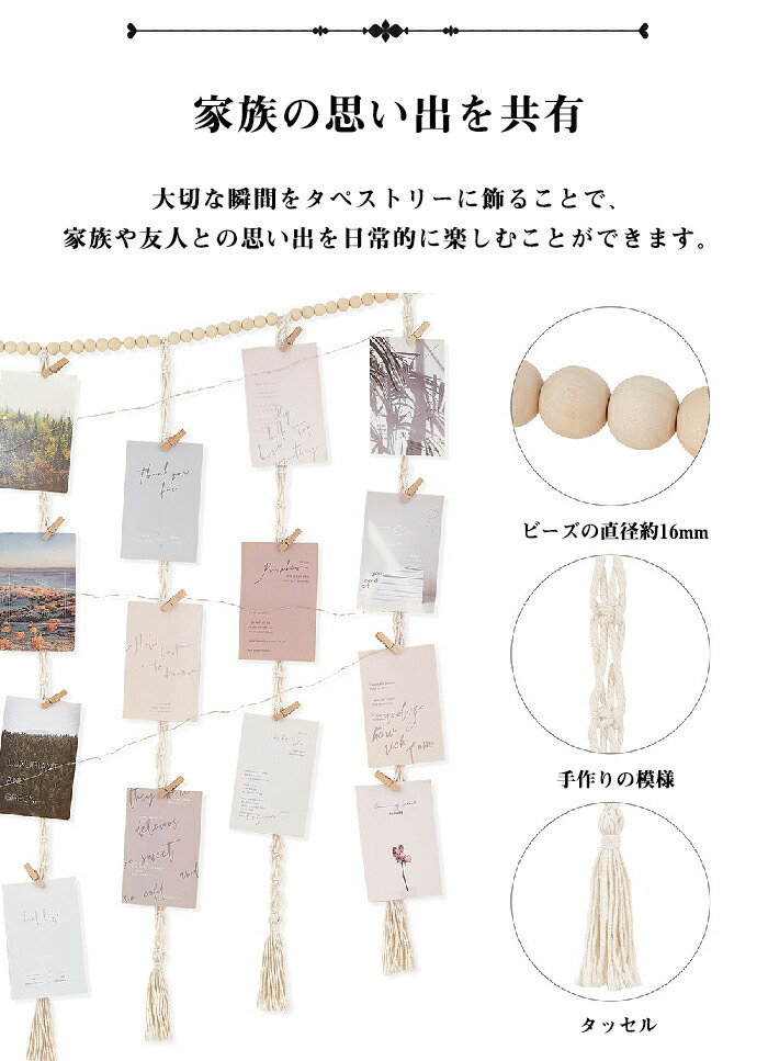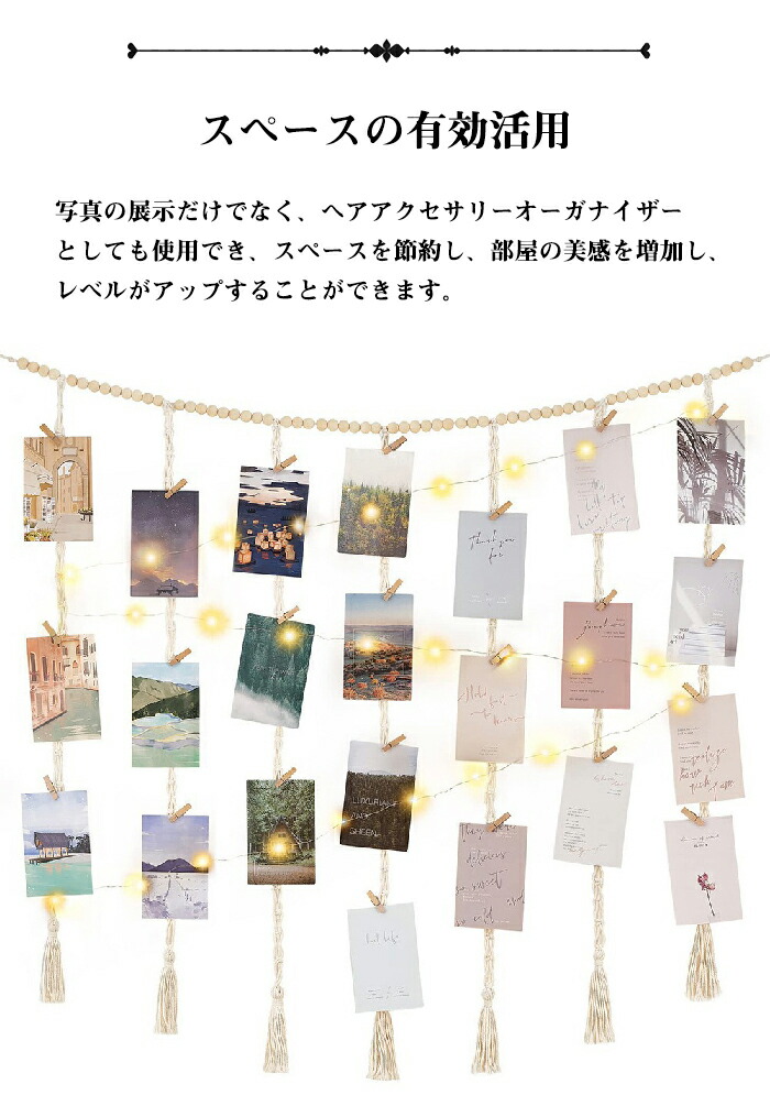 商品名:タペストリー マクラメ編み フォトフォルダー 写真立て ライト付き クリップ付き 北欧 吊り下げ ウォールデコレーション 壁掛け 飾り 木 おしゃれ ボヘミアン インテリア シンプル ナチュラル 手作り 自然 ハンギング 新築祝い 結婚祝い 手織り グッズ タペストリーフレーム 家族の写真をぶら下げ 壁に写真を表示する 写真