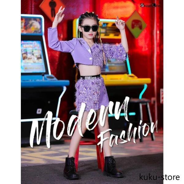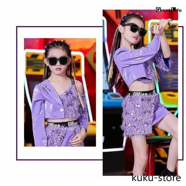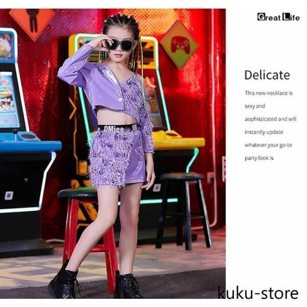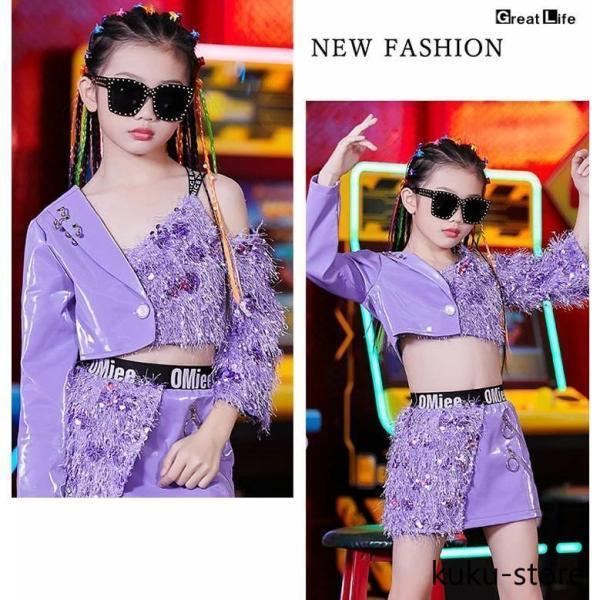 キッズ ダンス衣装 紫 セットアップ スパンコール キラキラ k-pop 衣装 女の子 パープル へそ出し スカート チアガール ヒップホップ ガールズ 子供 韓国 ダンス