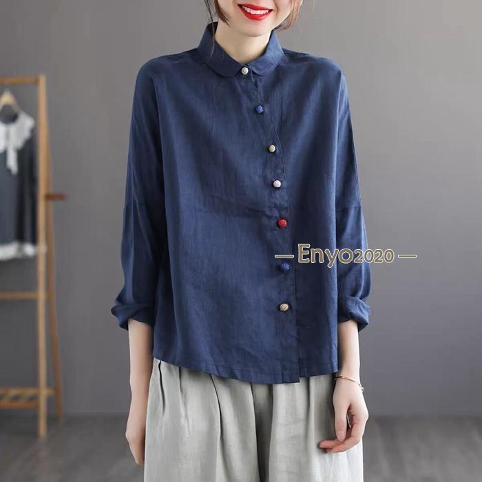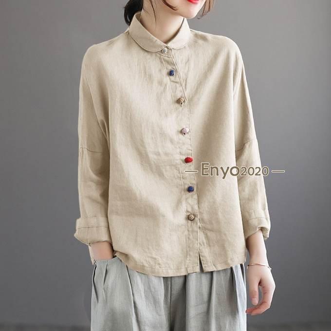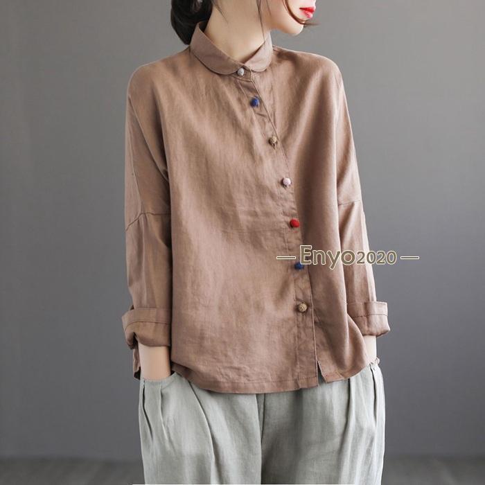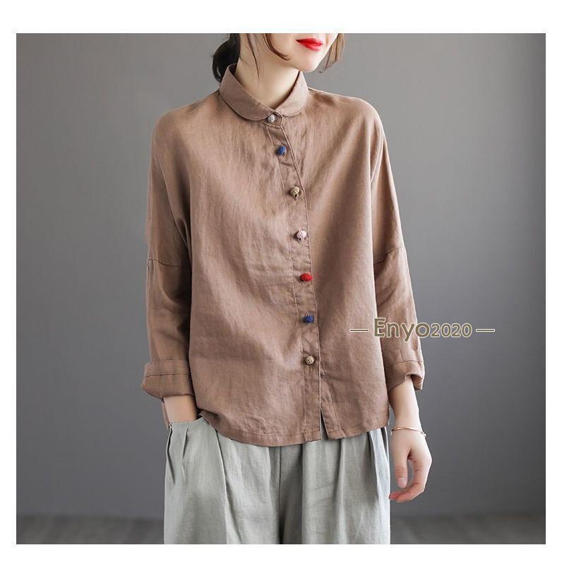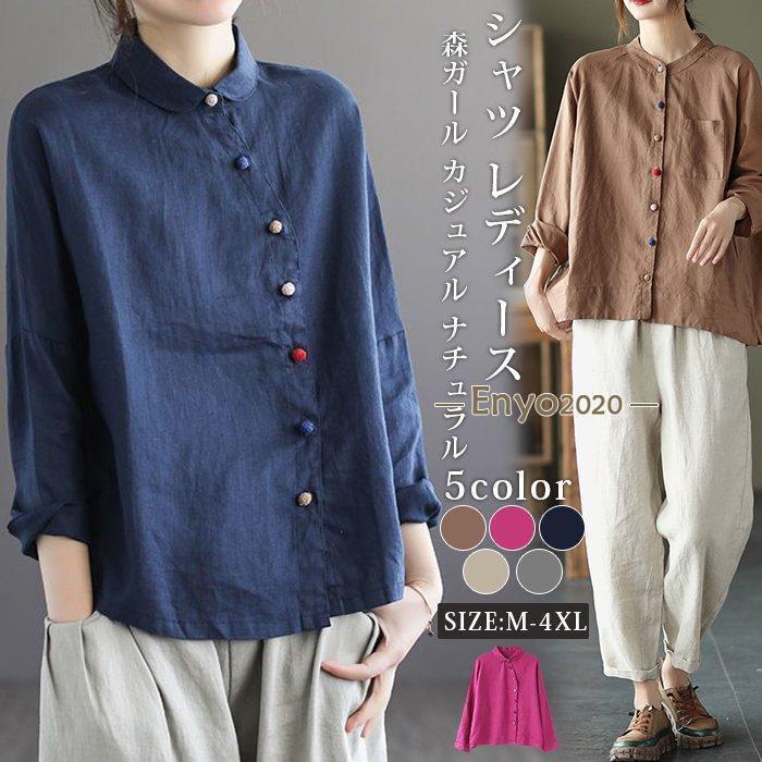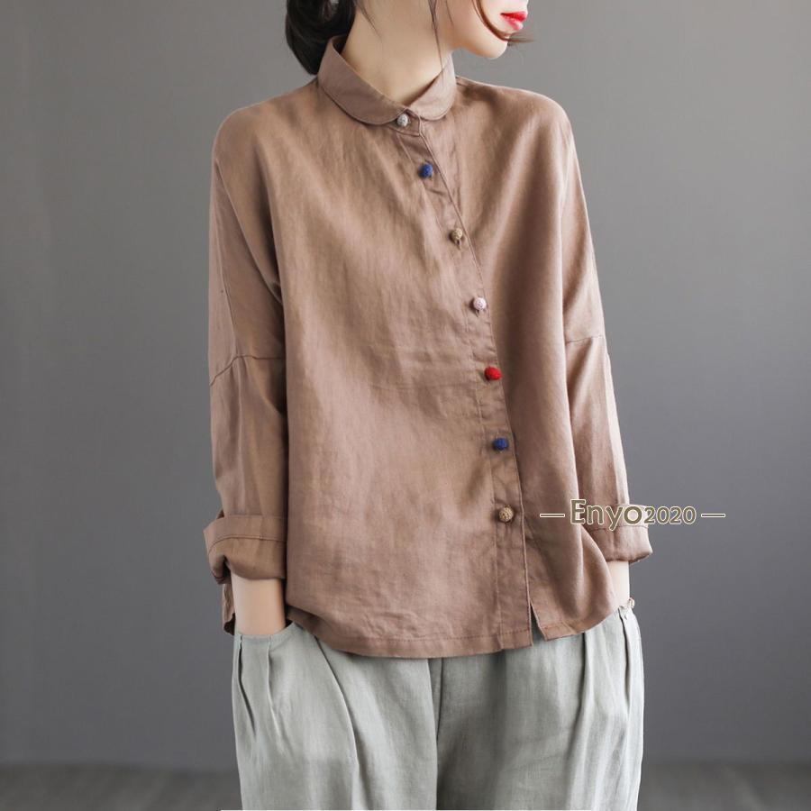 シャツ レディース ブラウス 綿麻 長 レディースファッション 続々登場 グレー ローズ コーヒー色 ネイビー 杏色 M L XL 2XL