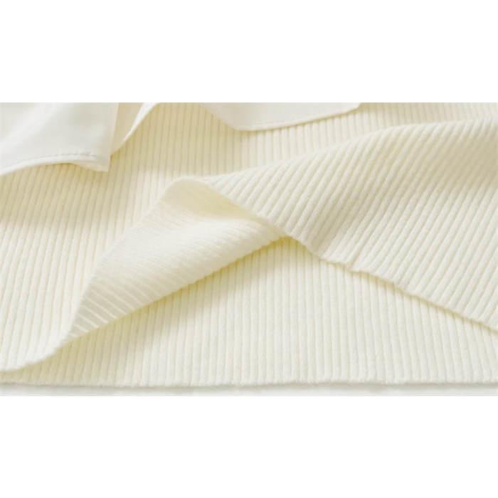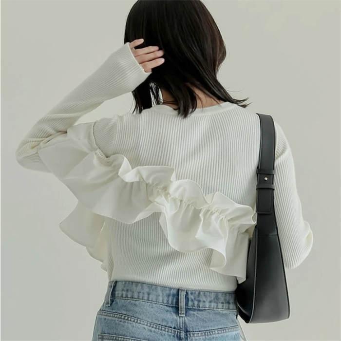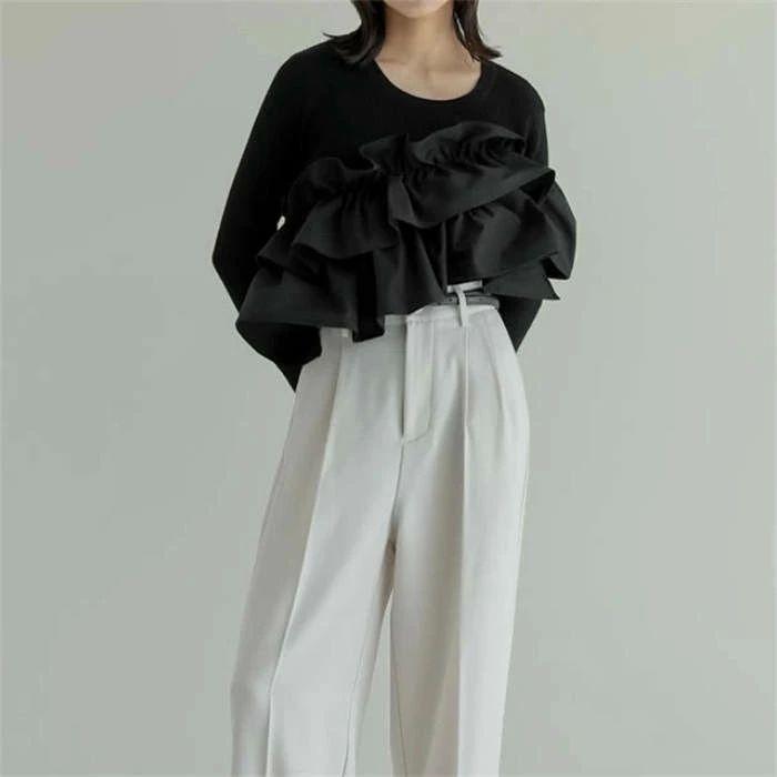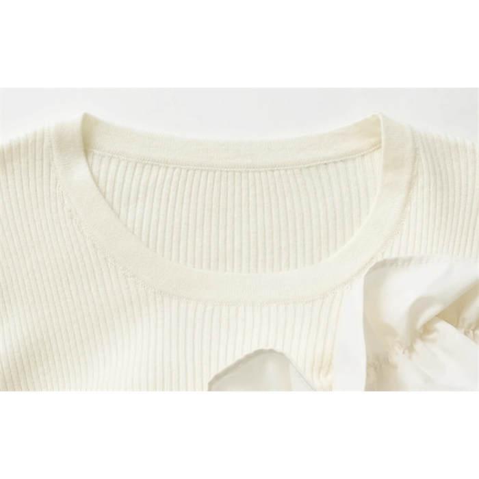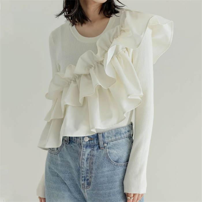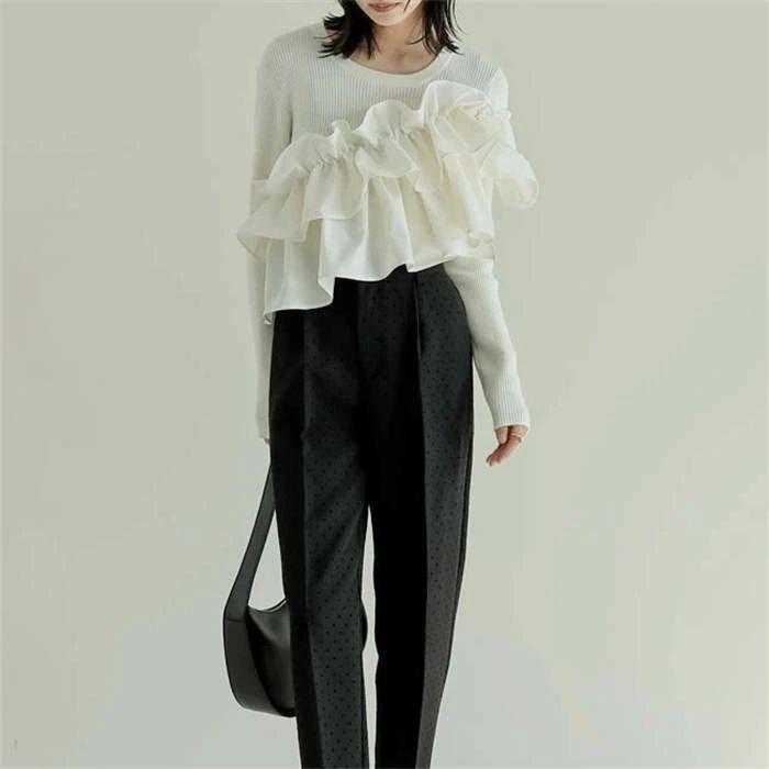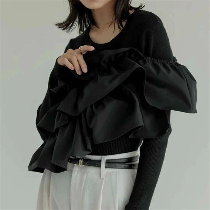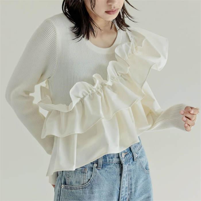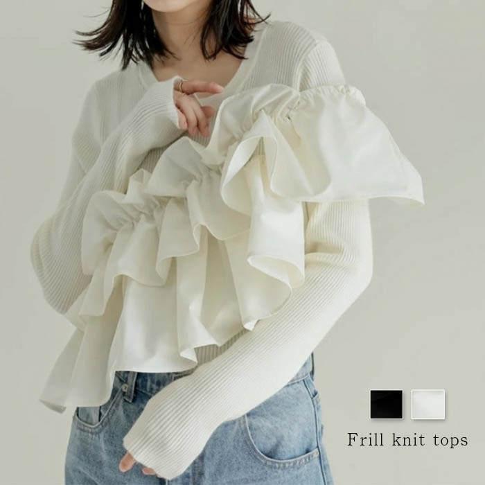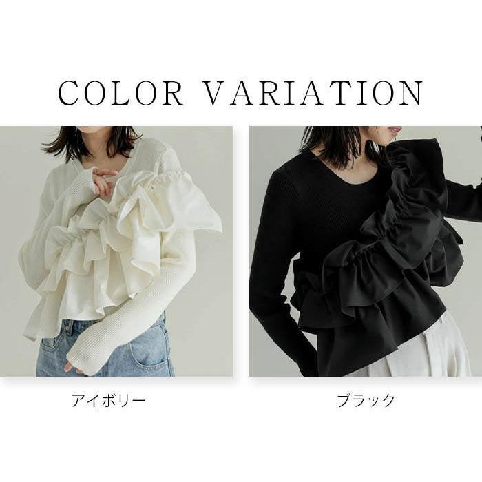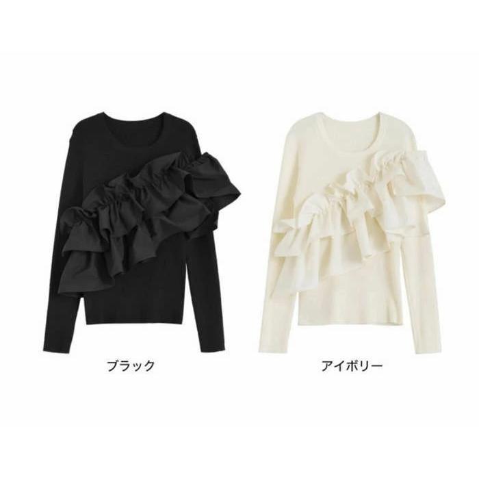 チュールフリルリブニット カットソー トップス シャツ ブラウス 新登場! ブラック アイボリー
