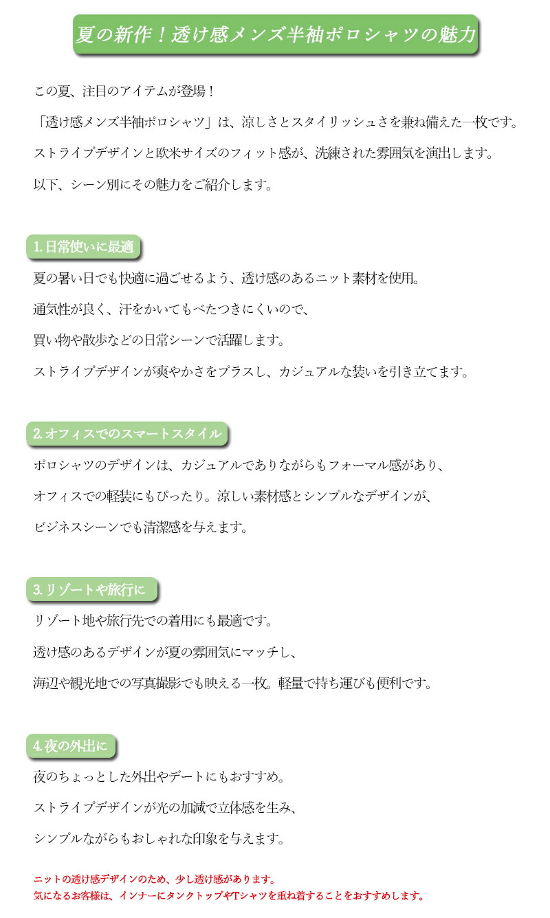 関連キーワード ニットポロシャツ 半袖 メンズ 透かし編み ストライプ 襟付きVネック サマーニット おしゃれ 透ける レイヤード リラックス トップス 吸湿速乾 半袖tシャツ ゆったり カットソー 個性的 カラフル 夏服 プレゼント メンズファッション
