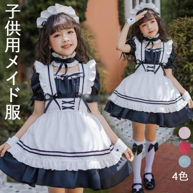 子供メイド服 子どもワンピース 女の子コスチューム キッズ半袖ワンピ メイドコスプレ 定番 可愛いコスチューム コスプレ衣装 ハロウィン衣装 パーティー 学園祭 かわいい 萌え イベント 110cm 120cm 130cm 140cm 150cm 5点 4色