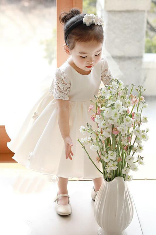 キッズドレス 女の子レースドレス 半袖 子供フォーマルドレス キッズ 子供 フレアワンピース 無地 花飾り 団体服 合唱団 舞台衣装 発表会 演奏会 音楽会 結婚式 ウェディング イベント 誕生日会