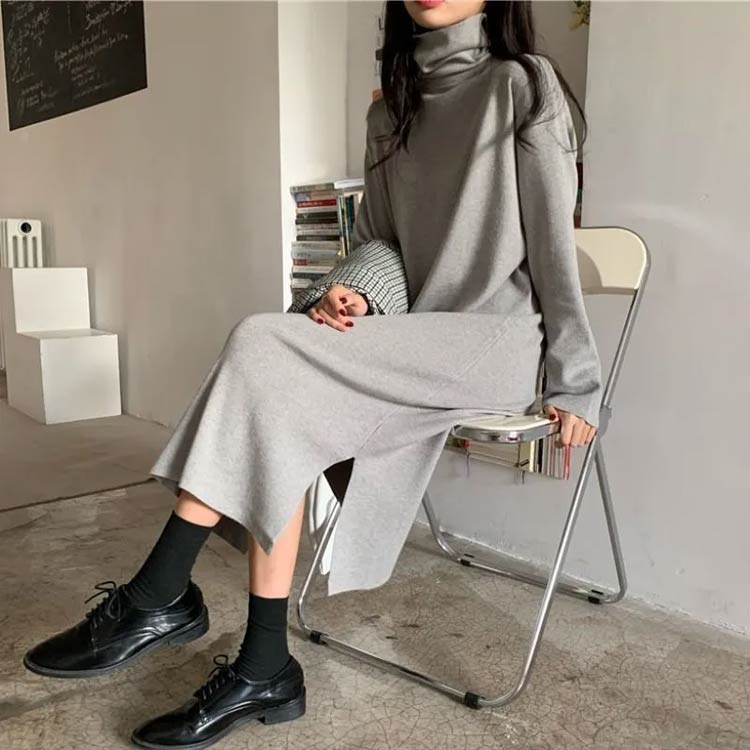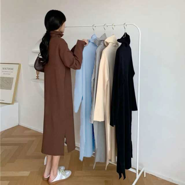 ワンピース レディース タートルネック 長袖 ワンピ ハイネック 長そで 膝下 ひざ下 ゆったり 無地 ロング丈 ロングワンピース ブラック グレー コーヒー ブルー ベージュ