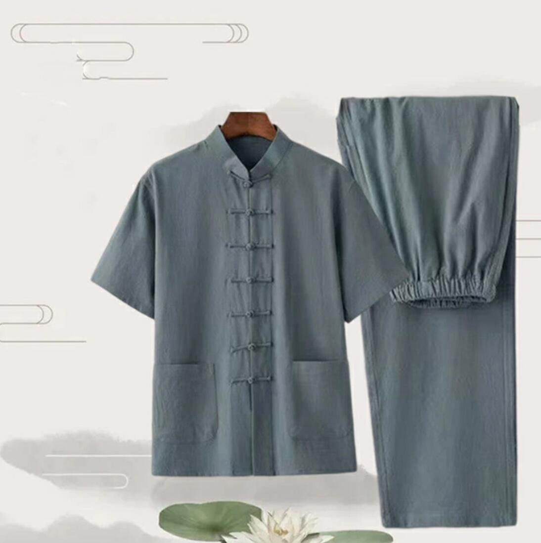 メンズ 綿麻太極拳ウェア チャイナ服 リネン太極拳服 半袖シャツ ロングパンツ 2点セット 上下セットアップ 練習着 カンフー服 中華服 武術服 チャイナボタン ポケット付き 通気性 春夏 涼しい 朝練 トレーニング ランニング スポーツウェア 上下セット プレゼント 7色 M-4XL