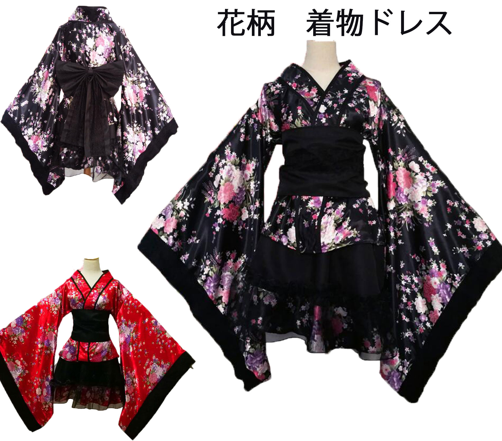 仮装 コスプレ ハロウイン 着物ドレス ミニドレス 浴衣 ダンス衣装 花魁 キャバドレス 大人コスチューム 文化祭 ダンス 演劇 舞台 イベント 花柄 和風ドレス 4点セット 2色 振袖