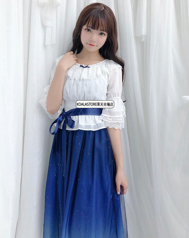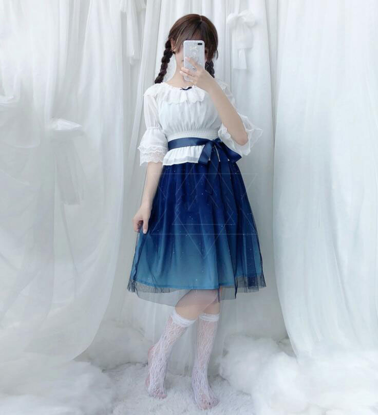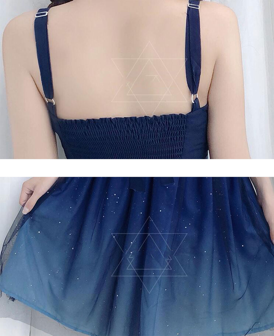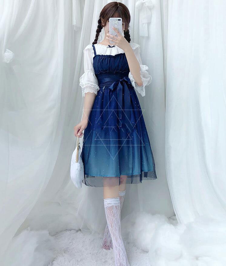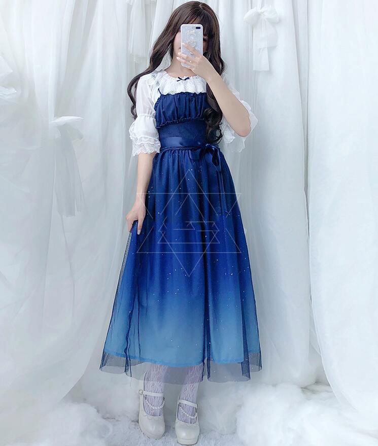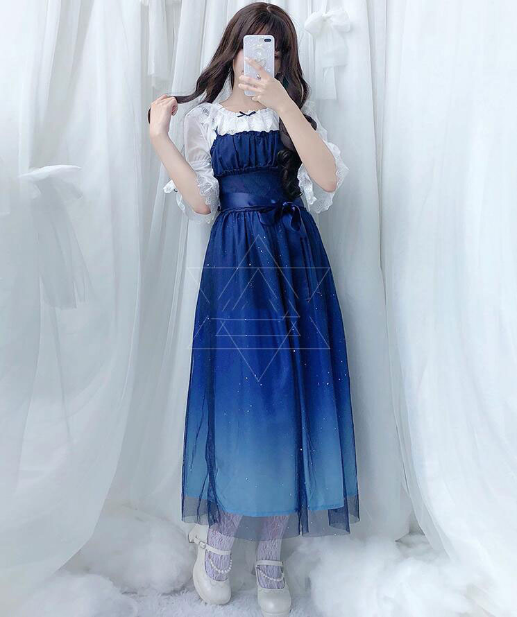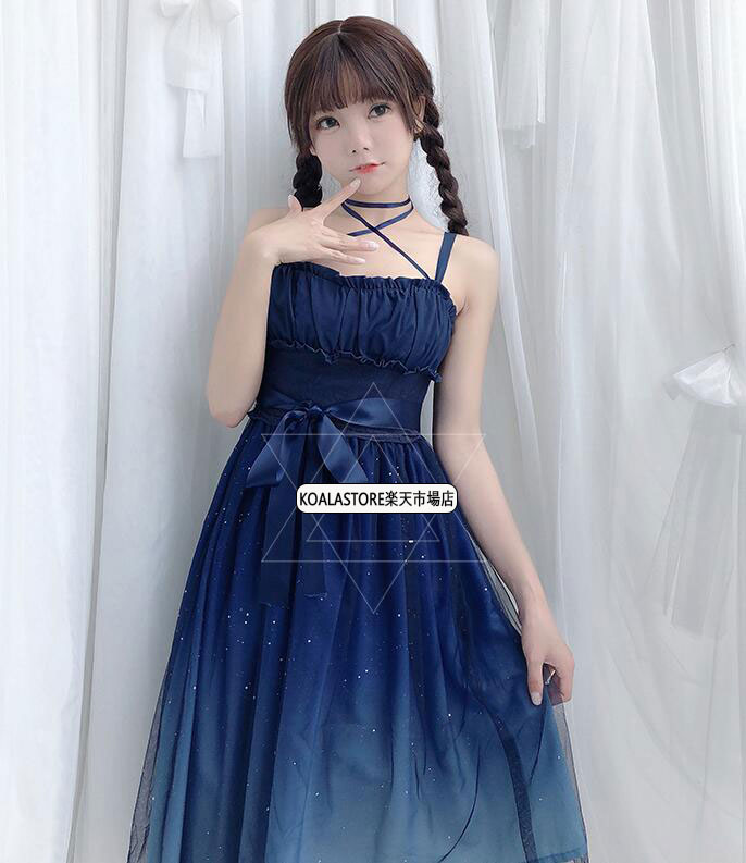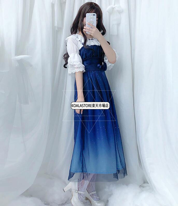 レディースワンピース 可愛いジャンパースカート ショート丈/ロング丈 グラデーション チュールワンピース 星屑柄 シフォンブラウス レディースドレス ロリータワンピース 大人可愛い かわいい キュット 美少女ウェア 夏服 デイリー パーティー 紺 S M L