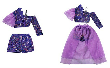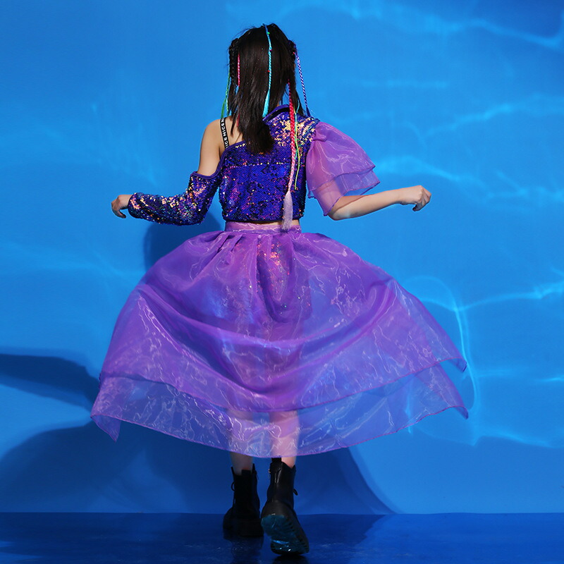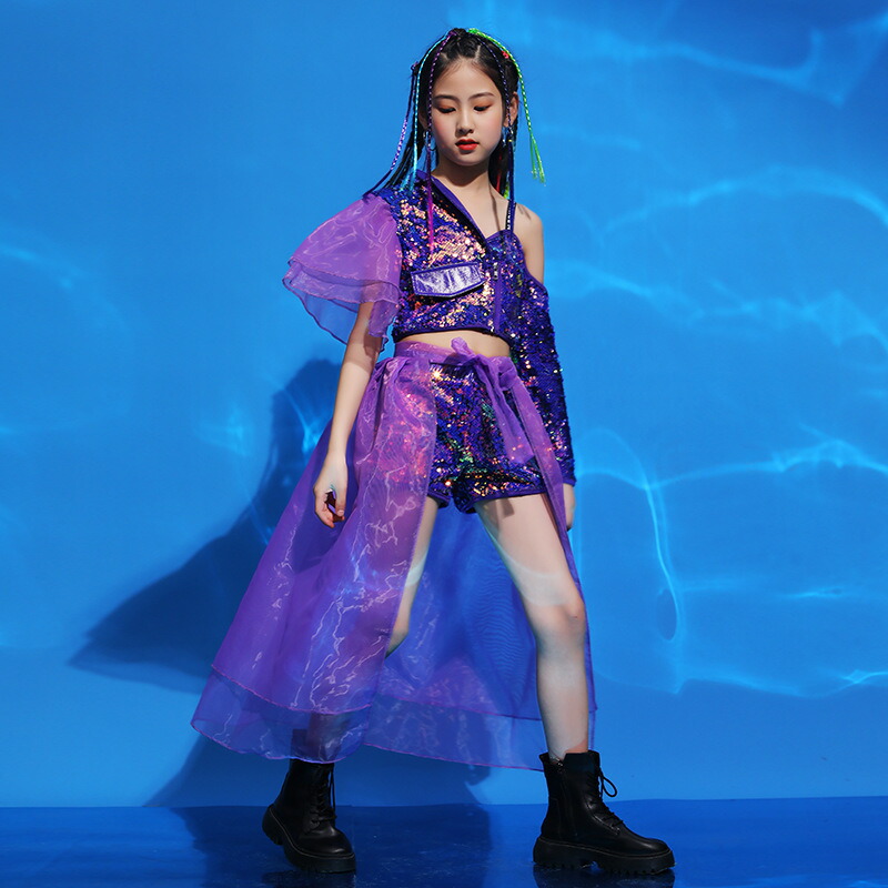 キッズダンス衣装 女の子 3点セット ジャズダンス hiphop トップス スカート パンツ スパンコール ヒップホップ こども ジュニア 子供服 上下セット ダンスセットアップ レッスンダンスウェア イベント 発表会 応援団 ステージ舞台演出服 練習着 チーム衣装 パープル
