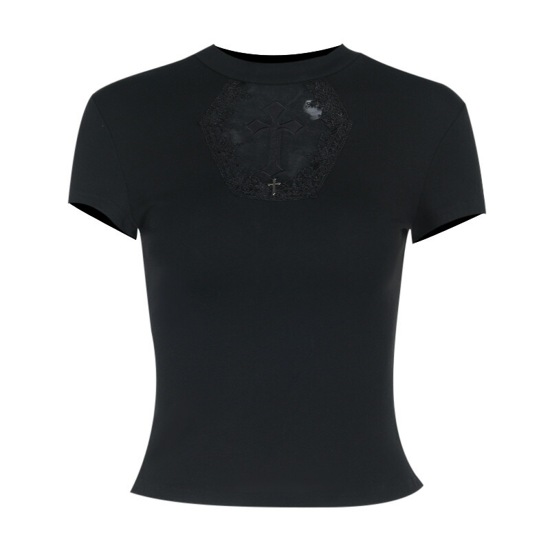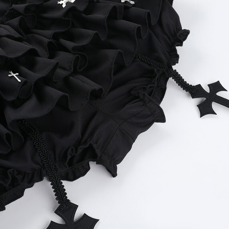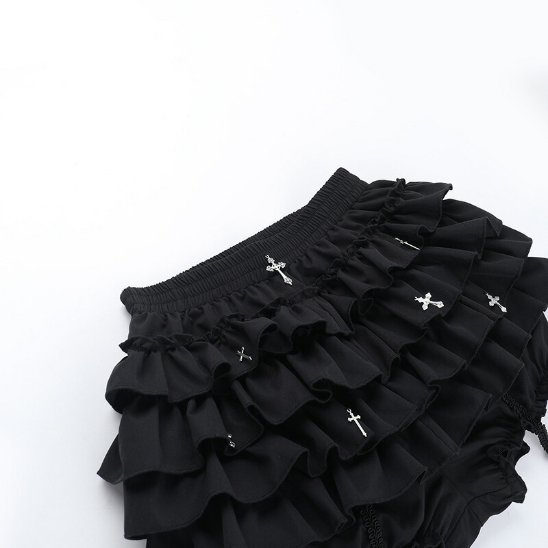 ボディコンケーキスカート 十字架チェーンチャーム付き 防透けショートパンツ トップス追加でき 2点セット ストリートギャル アゲ嬢 パンク風 ゴシック風 原宿系 ギャル系 ロック ハロウィンパーティー パーティー衣装 ステージ衣装 女装 黒 ダークモード ショートスカート
