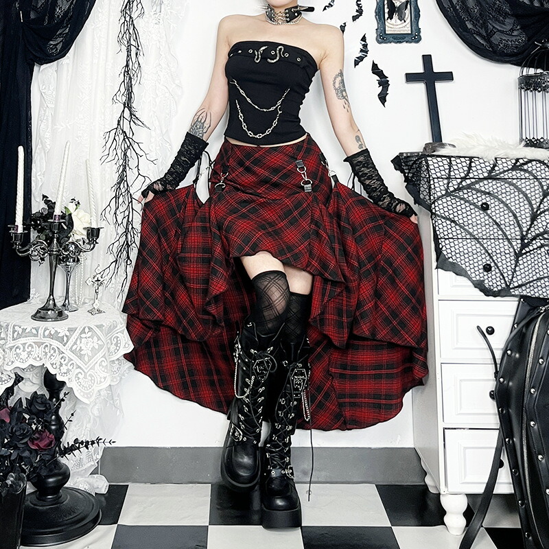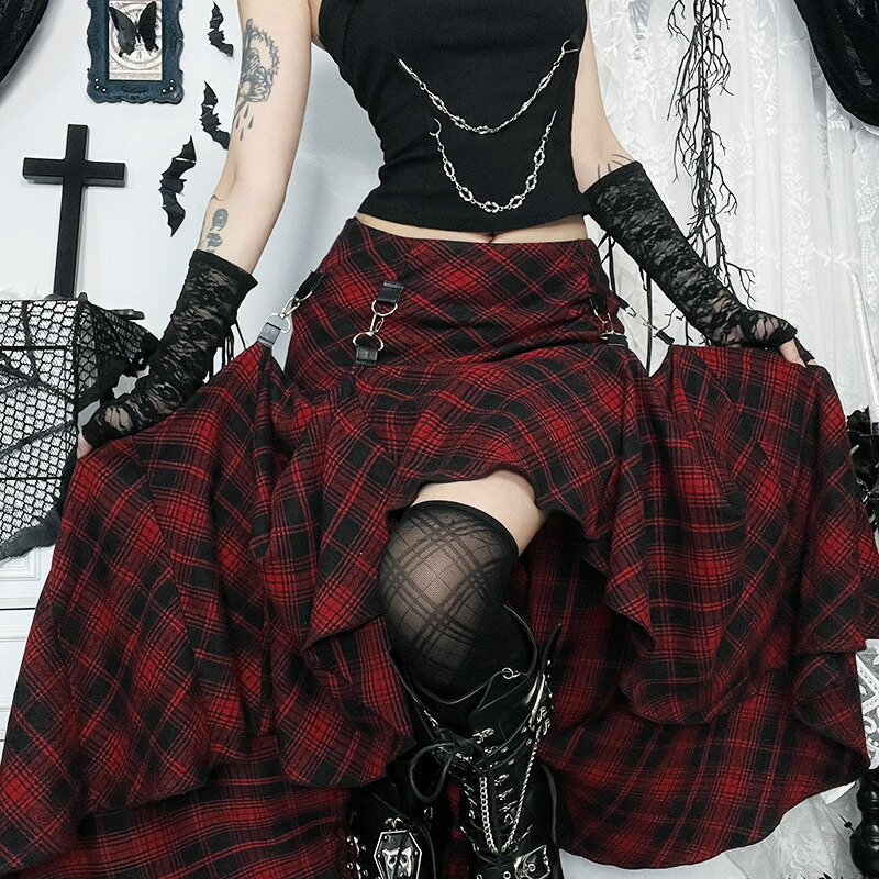 新作 春 夏 ダークゴシック 赤不規則チェックスカート 調節可能ベルト 大人ボディコン ダンス衣装 パンク風 ゴシック風 原宿系 ギャル系 ジャズダンス衣装 欧米風 ロック ハロウィ 個性的