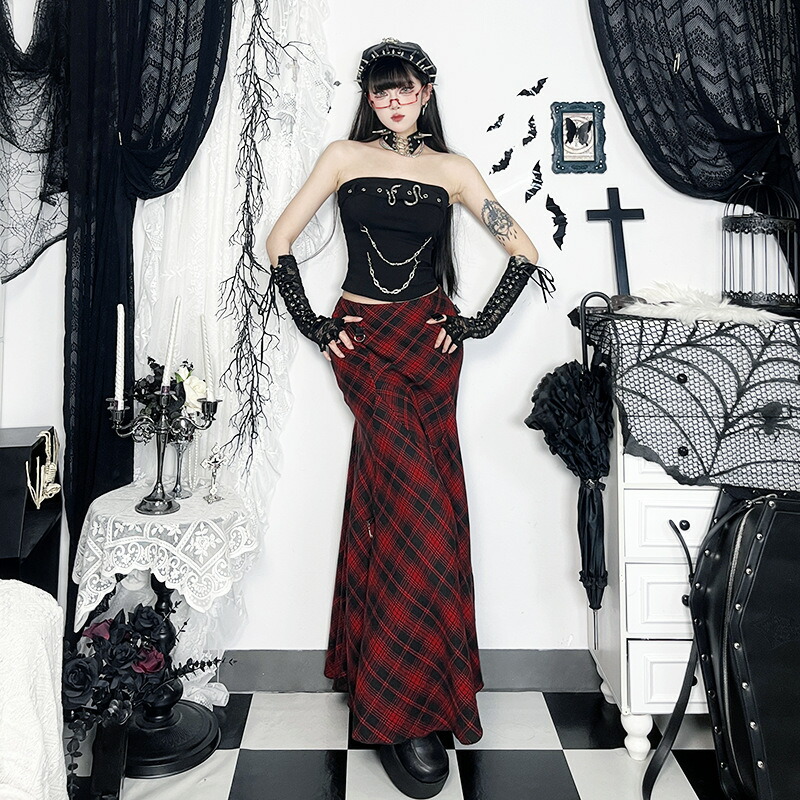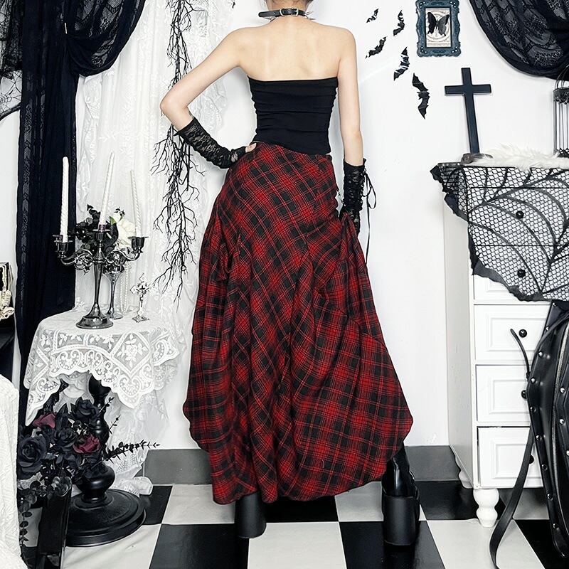 魔性の赤!歪みチェックゴシックスカート ひも結び自在デザイン 春のパーティー兼用 90年代ヴィジュアル系再現