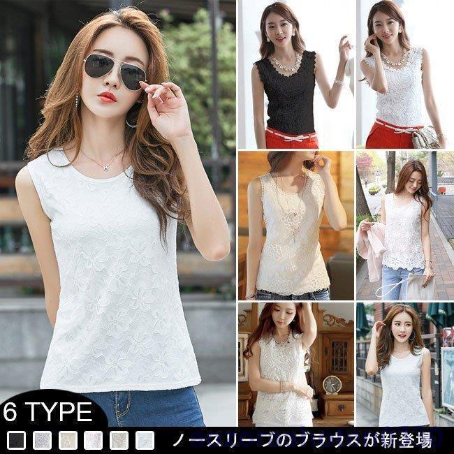レディース ノースリーブ ブラウス トップス 花柄 タンクトップ スカラップ ホワイト ブラック レース付き 女の子 可愛い フラワー 春夏
