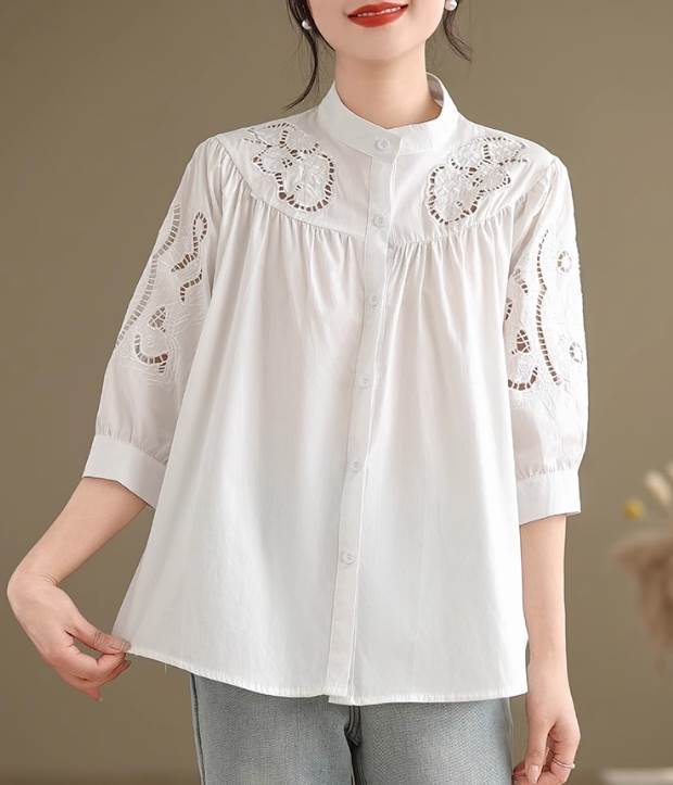 トップス レディース シャツ ブラウス 白シャツ 白トップス 夏 普通丈トップス 七分袖 二の腕カバー スタンドカラー ストレート レース ハリ感 カラバリあり ブラック 黒 ホワイト 白 赤