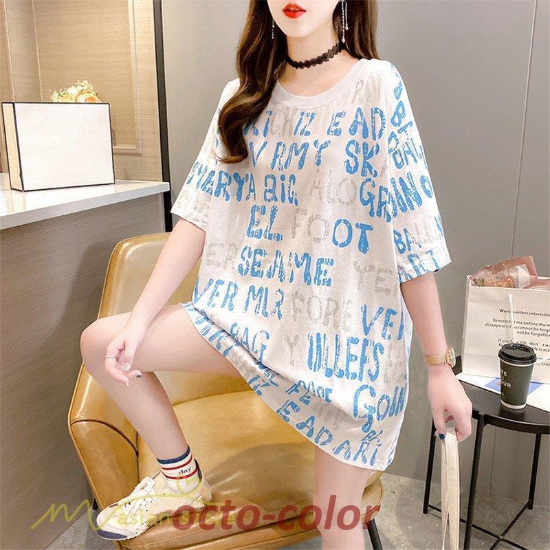 トップス レディース 半袖 Tシャツ ワイドtシャツ ミディアム丈 夏新作 カジュアルトップス 着回し プリント 丸首 着痩せ BF アウトドア 日常感 上品 ゆったり
