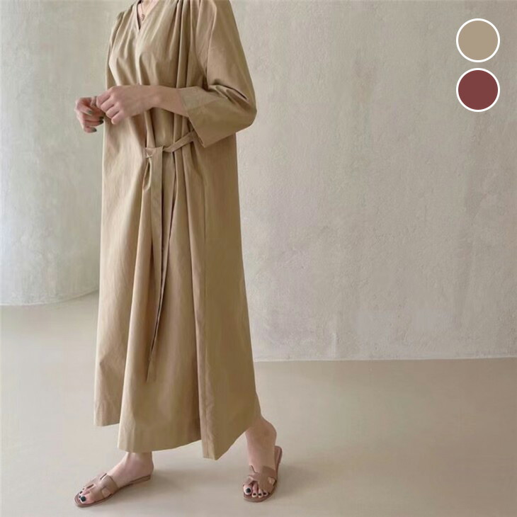 ネック マキシワンピース ワンピ サイドリボン 七分袖 肩ギャザー 楽ちん シンプルレディースファッション ワンピース