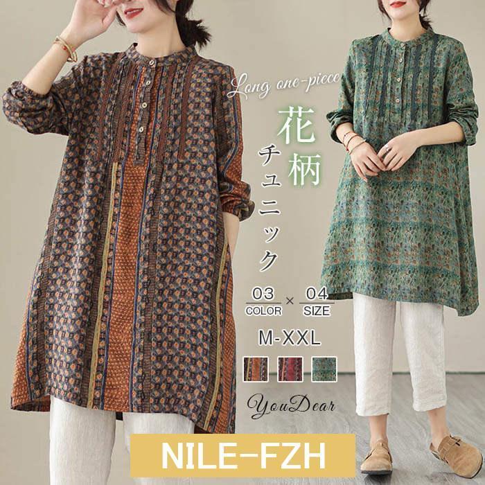 チュニック シャツワンピース ロングシャツ レディース 長袖 春 秋 チュニックシャツ 秋ワンピー コットン リネン 花柄 綿麻風 着痩せ 大きいサイズ