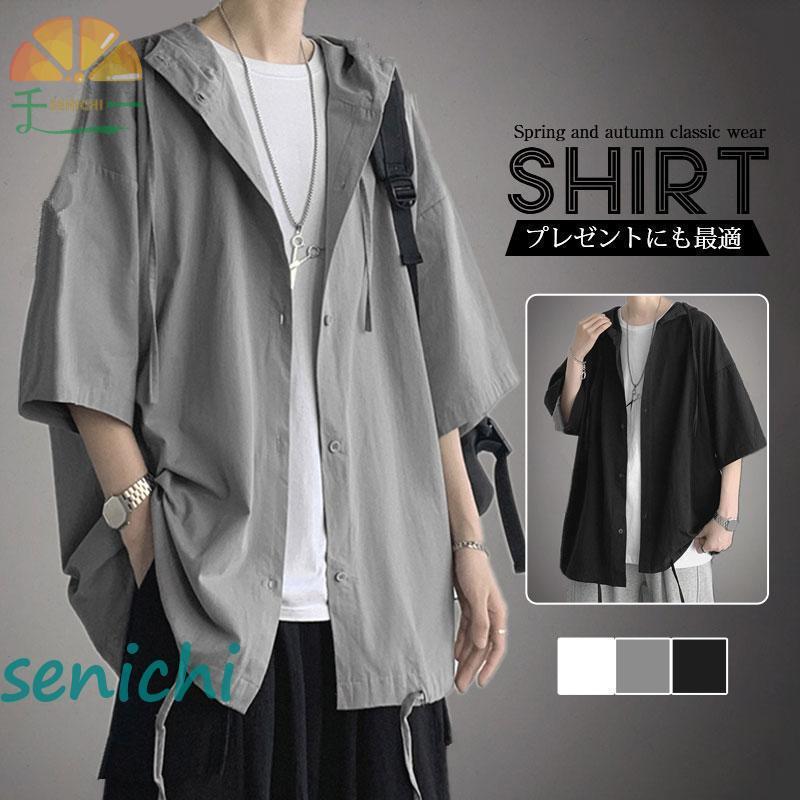 パーカー 七分袖シャツ メンズ 無地 開襟シャツ 半袖 カジュアルシャツ トップス フード付き 父の日 通学 お出かけ おしゃれ オーバーサイズ 体型カバー