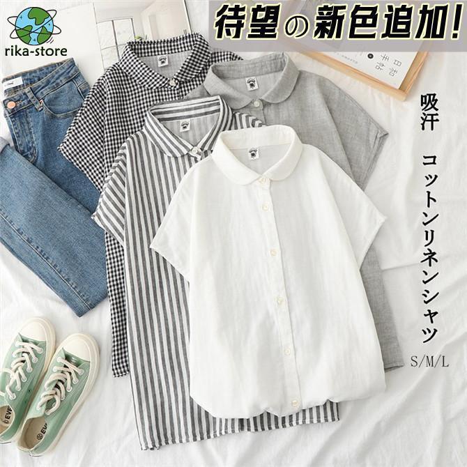 シャツ 夏 半袖 ブラウス レディース 無地 ストライプ柄 チェック柄 コットン 綿 柔らか シンプル 折り襟 ボタン留め 通気性
