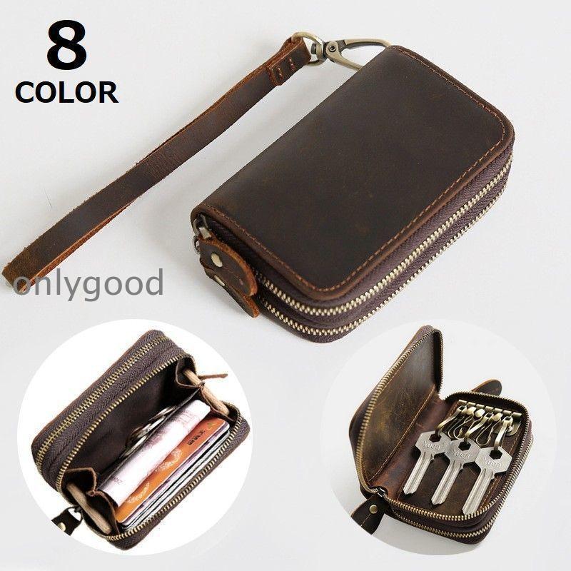 キーケース メンズ レディース ダブルファスナー 小銭入れ コインケース ミニ財布 レザー 本革 ストラップ付き カードポケット