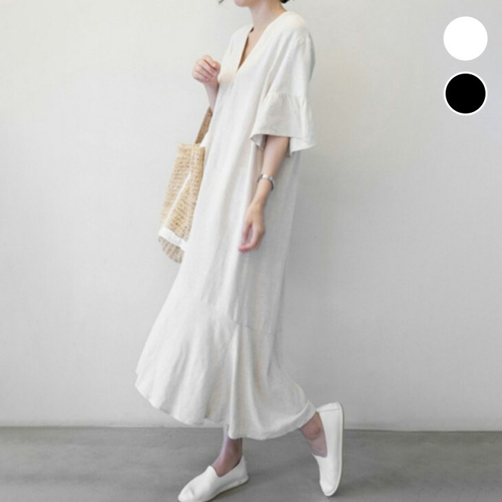ワンピース ロング丈 半袖 ロングワンピース カットソー vネック ボタン ゆったり 無地 シンプル カジュアル 通学 通勤 20代 30代 40代 体型カバー