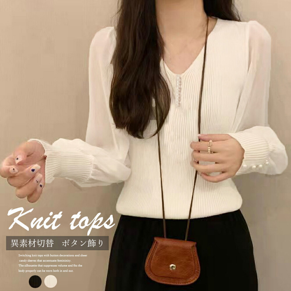 ニットトップス レディース シフォン袖 ニットソー 異素材切替 Vネック トップス カジュアル ボタン飾り リブニット 春秋コーデ きれいめ miniministore 85YN-900267 長袖