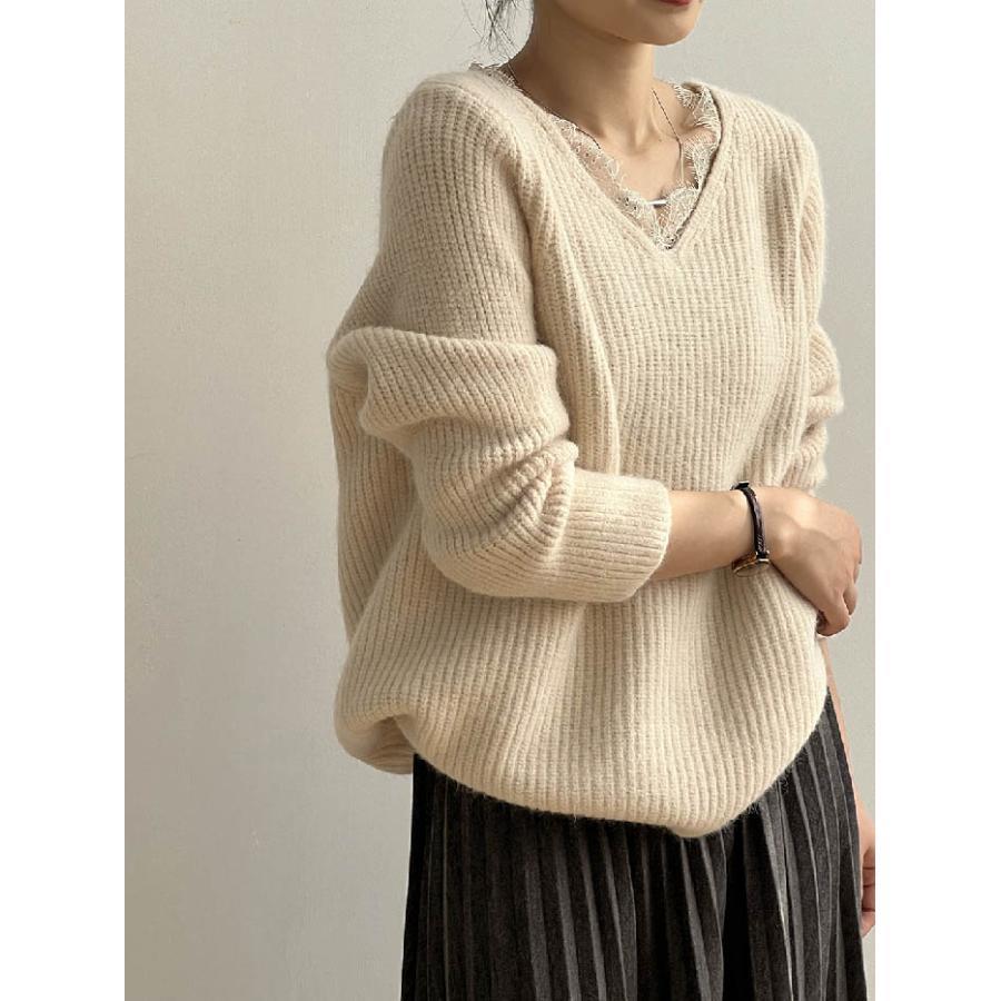 ニット レディース セーター Vネック 襟レース 秋 冬 長袖 きれいめ トップス カットソー お洒落 フェミニン シンプル カジュアル 体 着回し