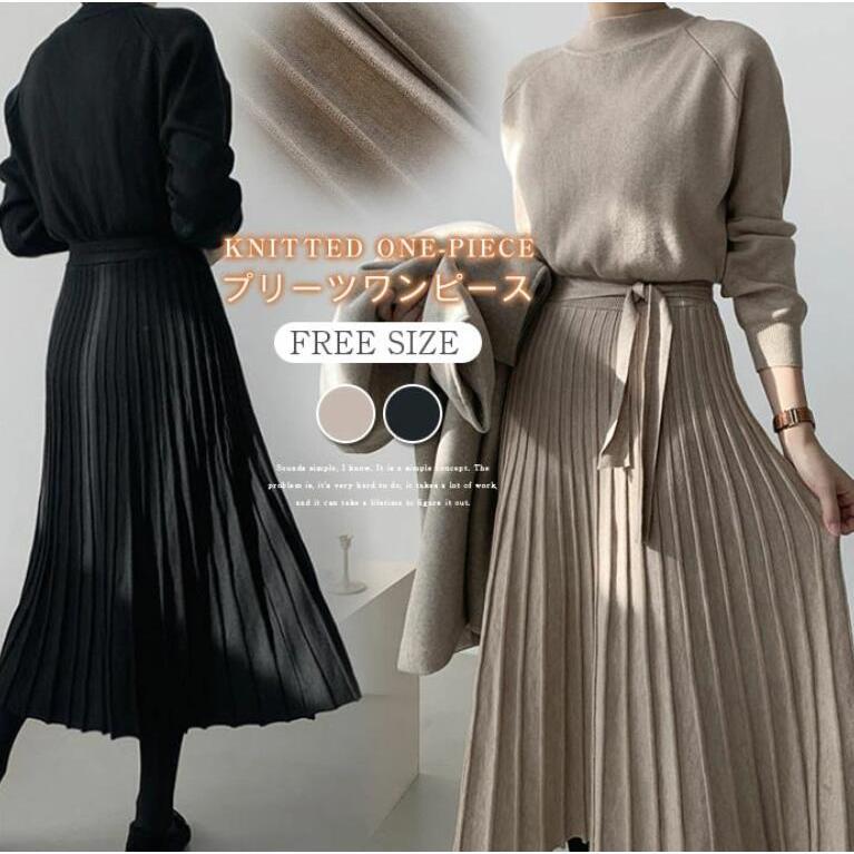 ニットワンピース 秋冬 大人 長袖 きれいめ ロングワンピース プリーツ ワンピース フレア プリーツワンピース おしゃれ ワンピ 黒 ニット大人