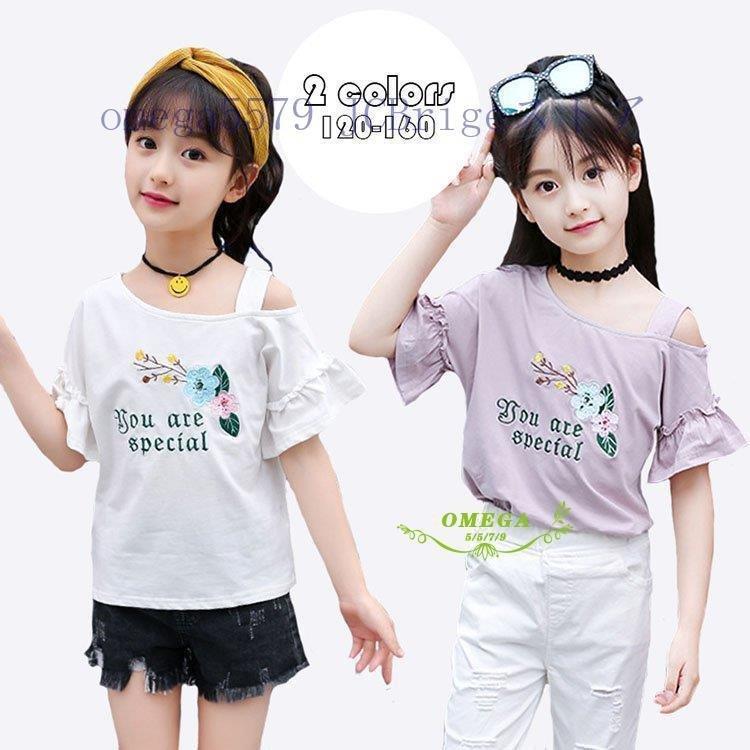 子供服 Tシャツ キッズ 女の子 韓国子供服 綿 半袖 肩出し 丸い襟 刺繍トップス おしゃれ 子ども服 夏 半そで ジュニア服 カジュアル 普段着 通学着 2色 可愛い
