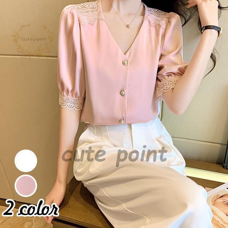 ブラウス レディース きれいめ 40代 春夏 上品 パフスリーブ vネックブラウス レース トップス 半袖 着痩せ 大人 通勤 韓国風