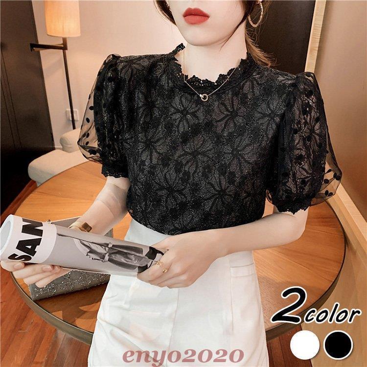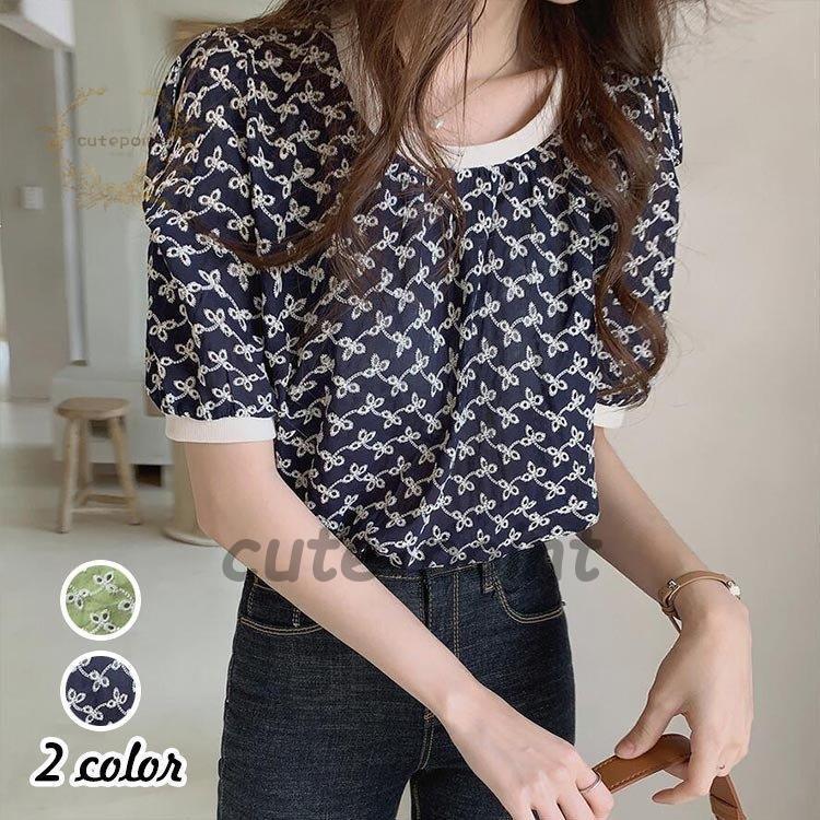 ブラウス レディース 春夏 半袖 パフスリーブ 花刺繍 シフォンブラウス 韓国chic Tシャツトップス通勤 着痩せ 新作 シャツ