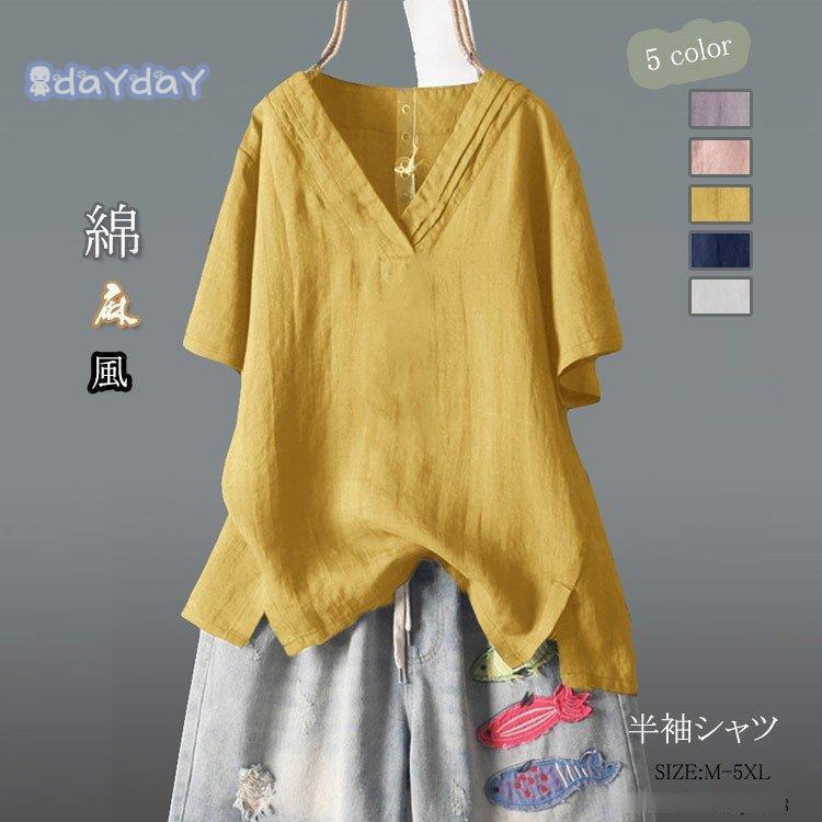 トップス プルオーバー シャツブラウス シャツ ブラウス レディース 綿 コットン 半袖 Vネック 無地 通気性 大きいサイズ ゆったり 春秋 30代 40代 体型カバー