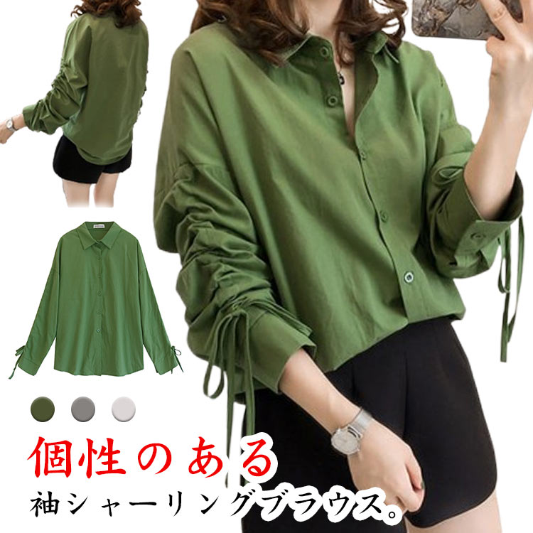 トップス 袖コンシャス 長袖 袖シャーリング きれいめ オフィスカジュアル ブラウス レディース シャツワンピースブラウス リボン ドロスト ギャザー袖 かわいい オフィス 通勤 通学